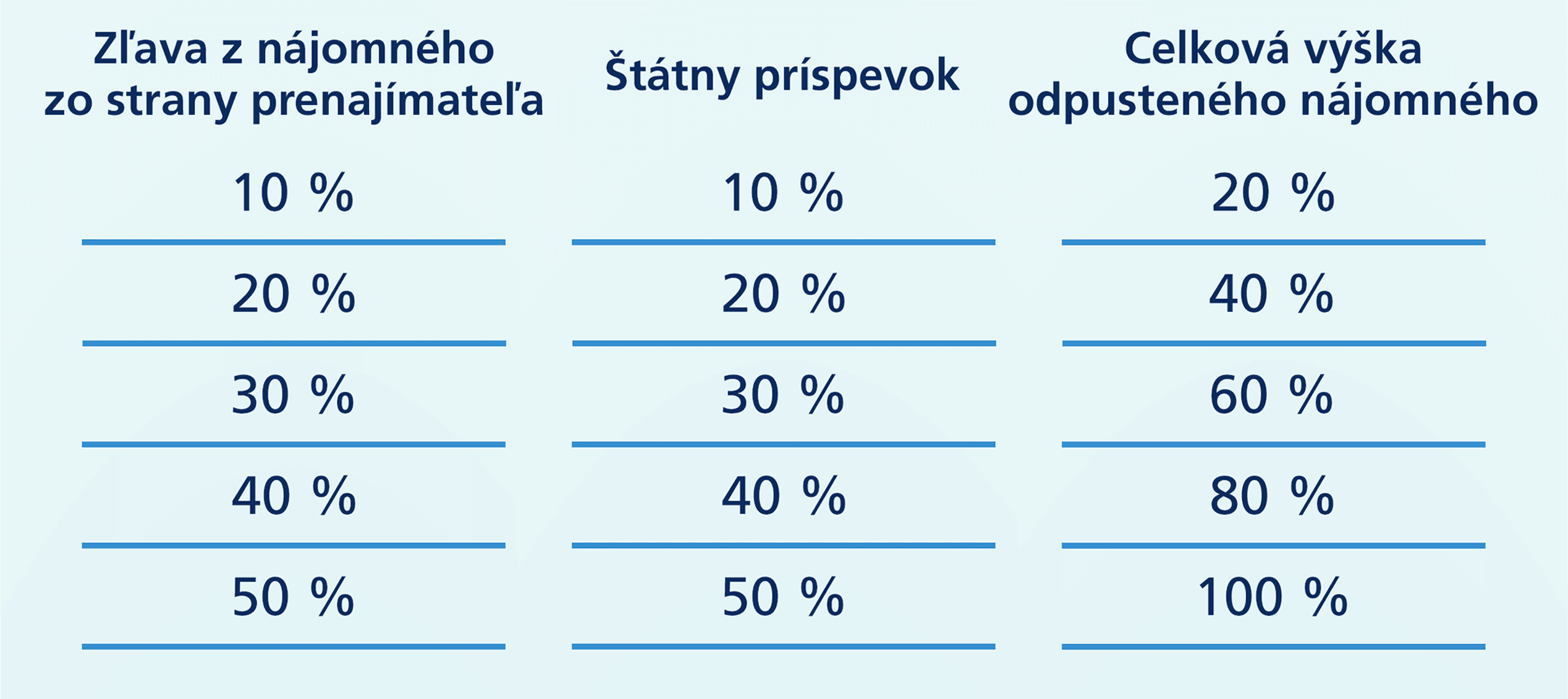 Ste podnikateľ alebo firma, ktorá musela zavrieť alebo obmedziť svoju prevádzku v prenajatých priestoroch počas pandémie? Štát vám podáva pomocnú ruku a za toto obdobie ponúka príspevok na nájomné. Výška príspevku však závisí od toho, akú zľavu vám z nájomného poskytol prenajímateľ. Rátajte ale s tým, že maximálna výška nemôže prekročiť 50 % nájomného. Je čas si sadnúť za okrúhly stôl a dohodnúť sa.