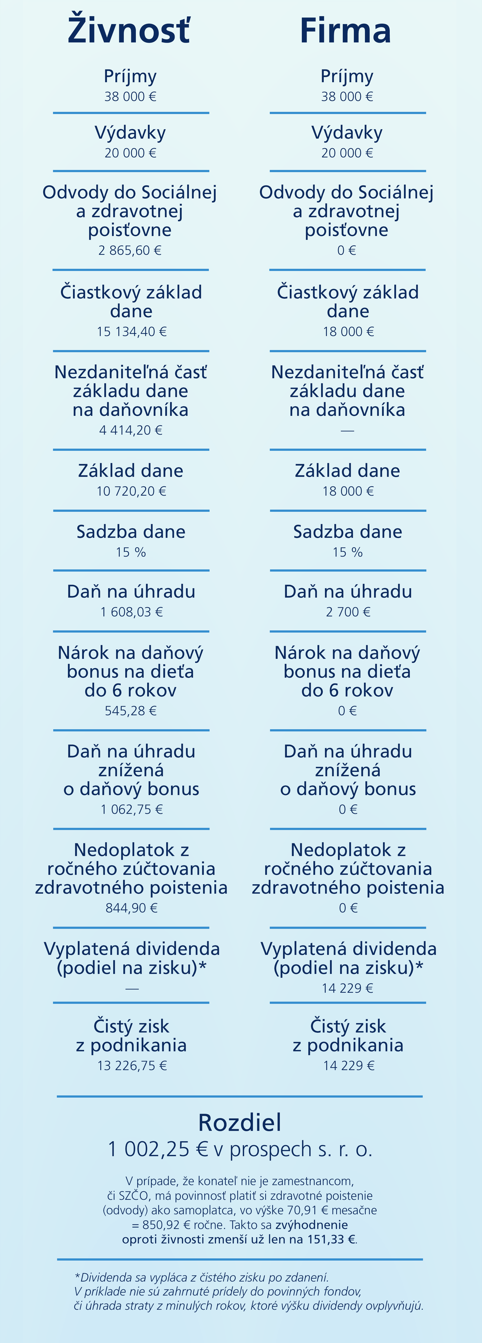 Živnosť môže byť výhodnejšou formou podnikania pre toho, kto predpokladá nižšie príjmy (zisk), a to hlavne z dôvodu možnosti uplatnenia si paušálnych výdavkov, ktoré sú aktuálne pre živnostníkov nastavené veľmi priaznivo. Na druhej strane sa živnostníkov týkajú odvody poistného do zdravotnej poisťovne a Sociálnej poisťovne, pokiaľ prekročia určitú hranicu príjmov.
