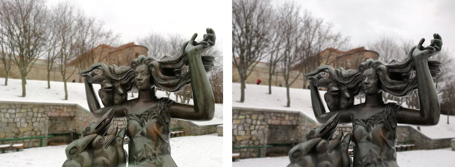 V prípade sochy pri Bratislavskom hrade fungovalo rozostrenie perfektne a fotke dodalo vzhľad takmer na nerozoznanie od zrkadlovky.