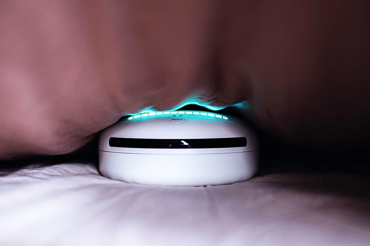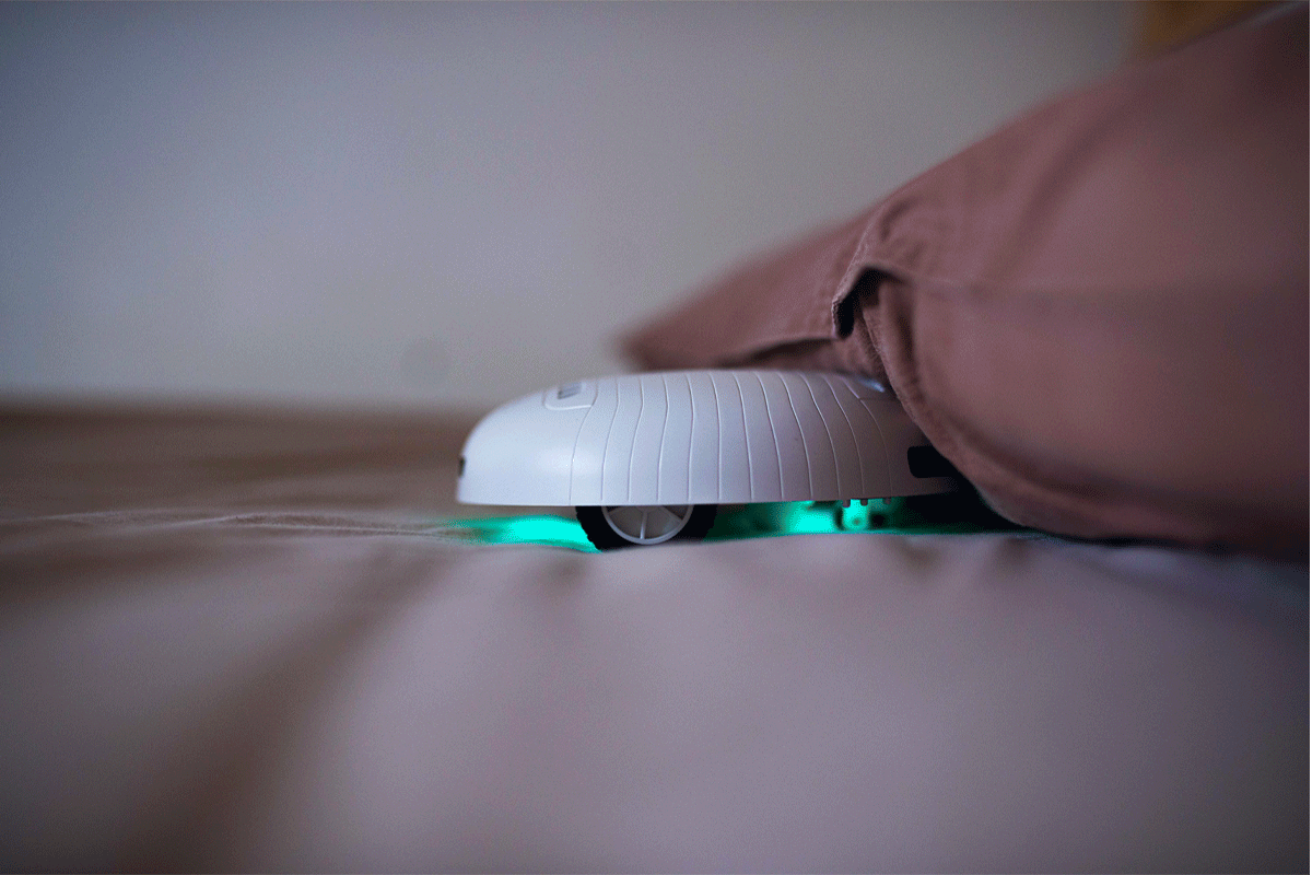 Dôvodov, prečo si tento robot zaslúži prívlastok cestovný, je však viac. Dokáže sa totiž pohybovať aj pod perinou a zároveň ju sterilizovať. Vďaka zabudovanému senzoru vie, že je prikrytý, a aktivuje aj trubice na vrchnej časti. Príjemne nás prekvapilo, že robot vie vliezť pod perinu aj sám a nevyhodnotí ju ako prekážku.