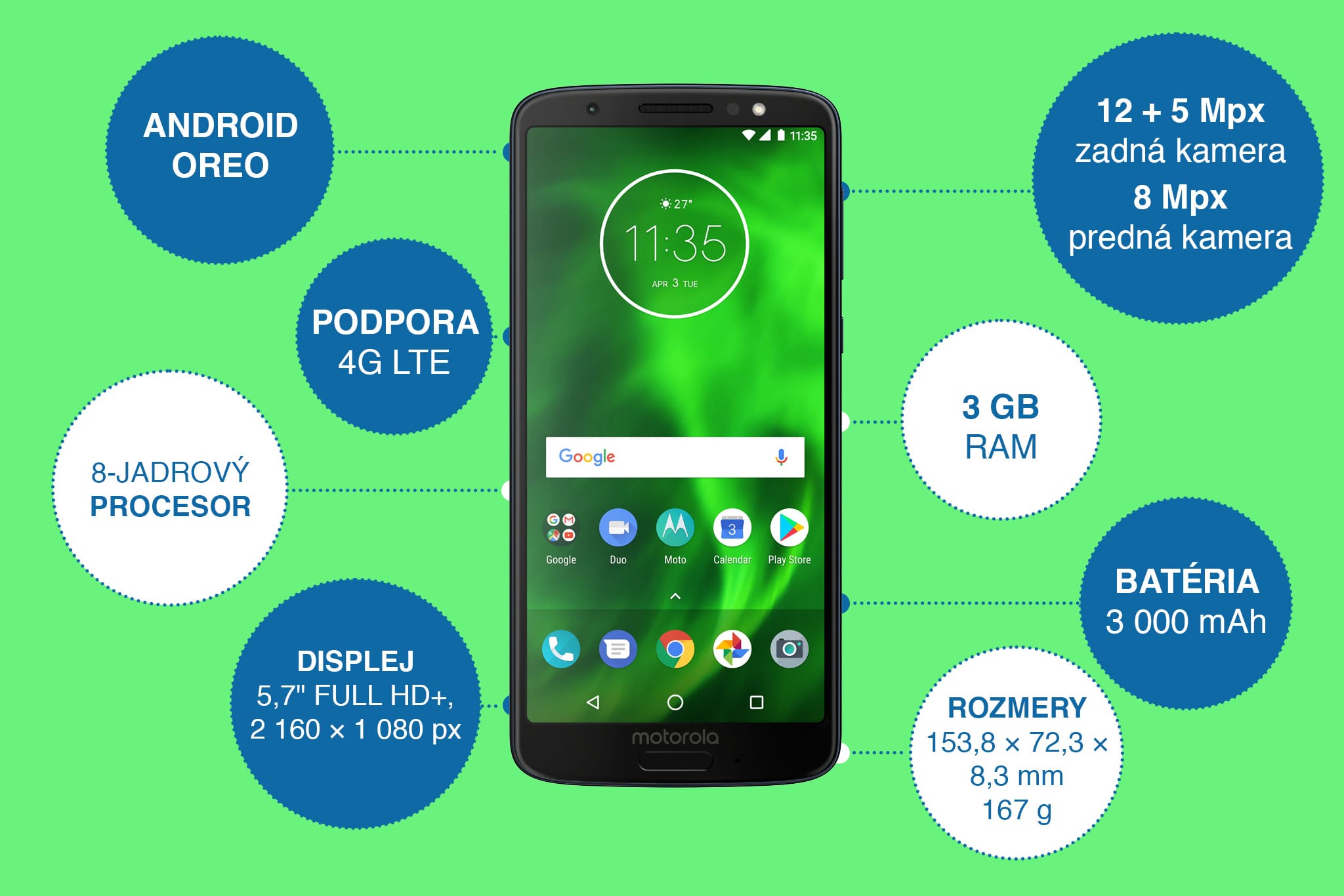 Smartfón Moto G6 je dostupný v hybridnej Dual SIM verzii. Môžete teda využiť dve nanoSIM karty alebo SIMkartu a pamäťovú kartu až do veľkosti 256 GB. Základná pamäť zariadenia je 32 GB. Nami testovaná verzia mala operačnú pamäť RAM s kapacitou 3 GB a 8-jadrový procesor Snapdragon 450 doplnený grafickým akcelerátorom Adreno 506.
