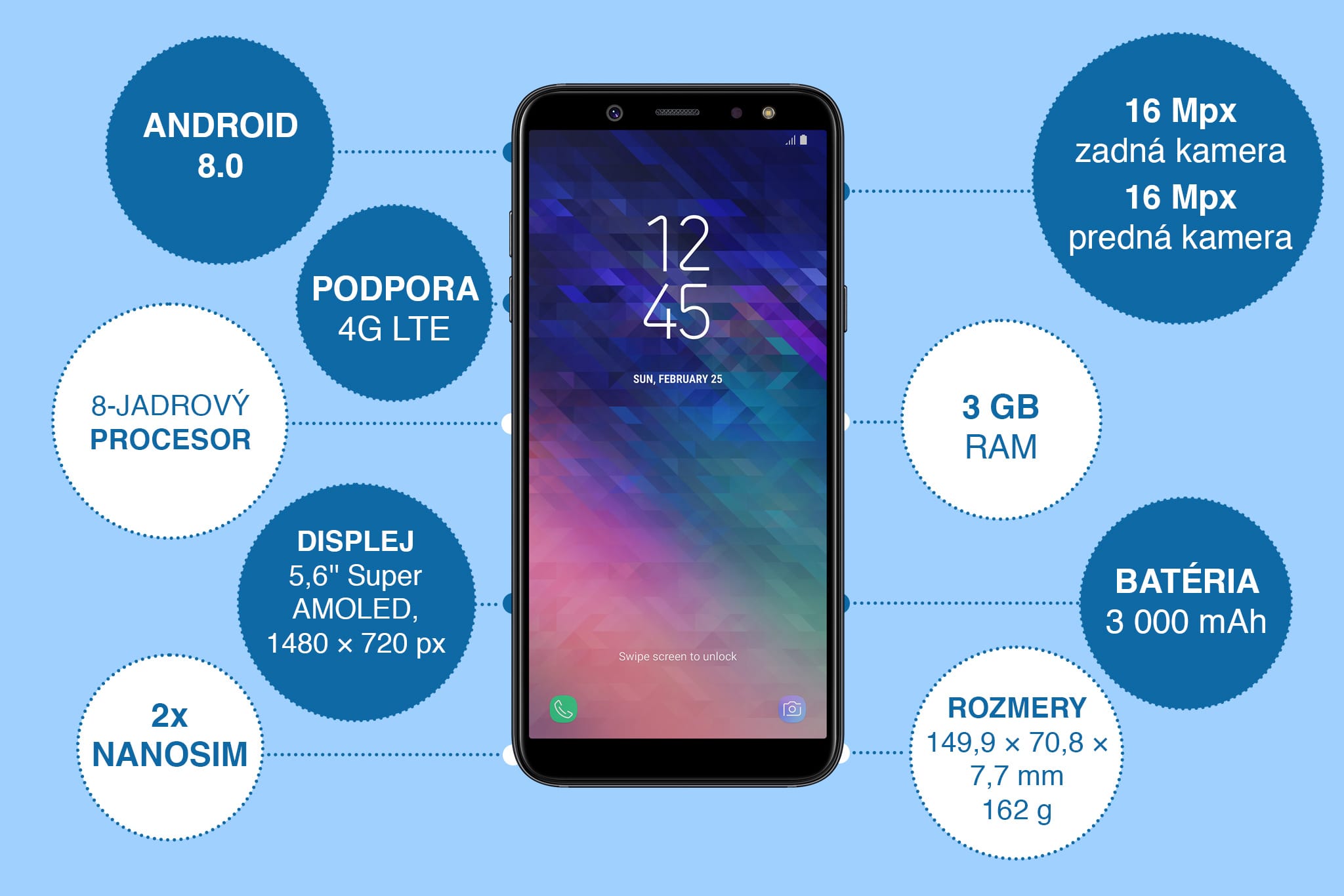 Novinka Samsung Galaxy A6 určite zaujme svojím tenkým kovovým telom a dizajnom, ktorý ocení takmer každý. Vďaka zdokonalenému fotoaparátu je určený pre všetkých nadšencov fotenia a selfie, pričom jeho výkon plne postačuje aj na náročnejšie aplikácie a hry.