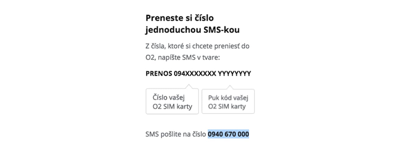 1. Z čísla, ktoré si chcete preniesť do O2, napíšte SMS v tvare: PRENOS 09XXXXXXXX YYYYYYYY