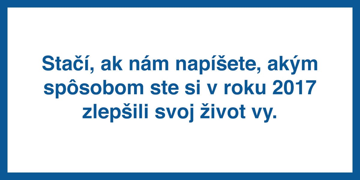 Na otázku Akým spôsobom ste si v roku 2017 zlepšili svoj život? nám odpovedala aj trojica známych osobností a najmä inšpiratívnych ľudí. Aj oni museli splniť základnú podmienku našej súťaže – vtesnať sa so svojou odpoveďou do požadovaného rozsahu 500 znakov.