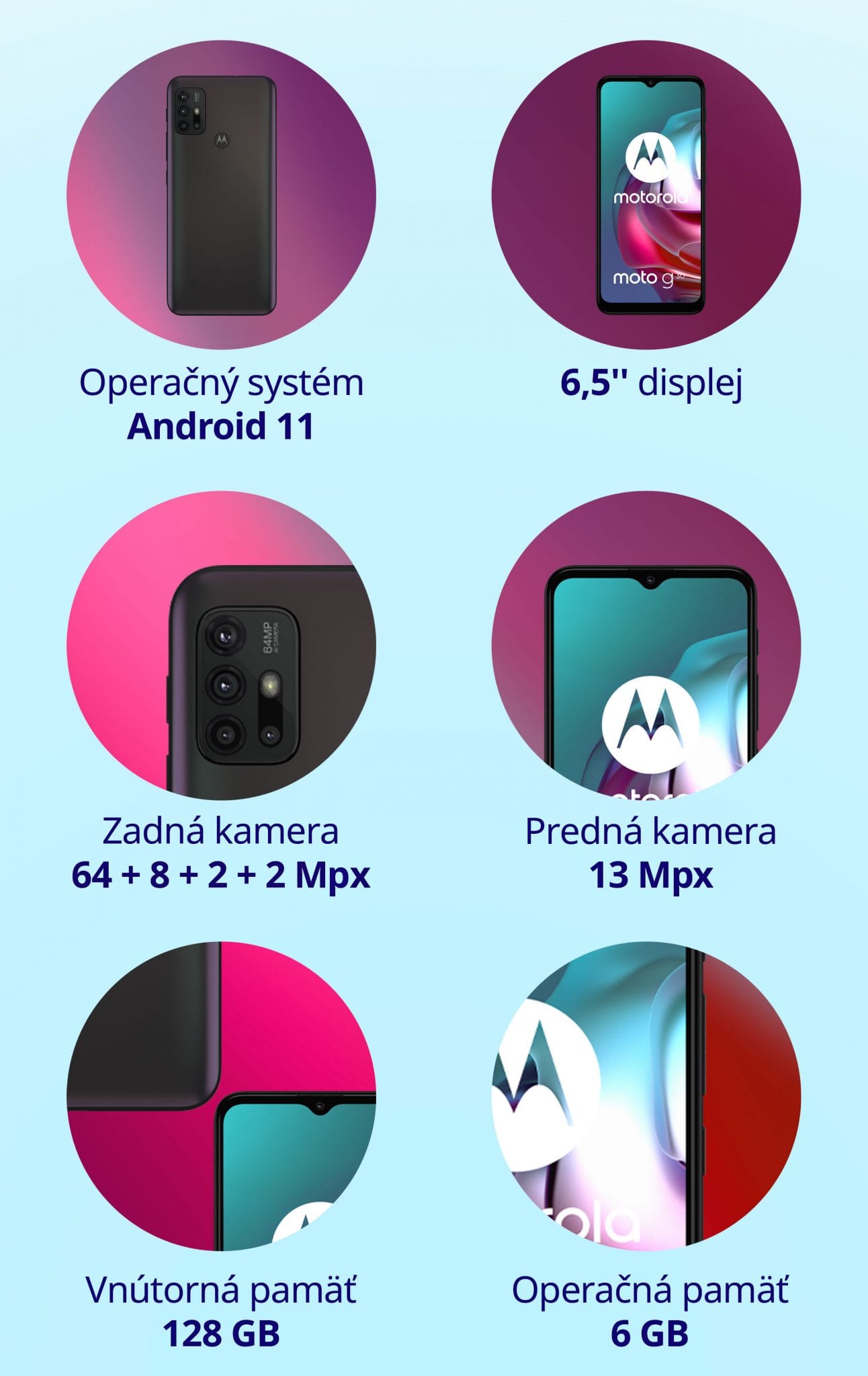 Motorola Moto G30 odporúčam všetkým, ktorí radi fotia, surfujú po internete, pozerajú videa a nebaví ich nabíjať svoj telefón každý deň. Tento smartfón si zamiluje už pri prvom pohľade na displej a zadný kryt.