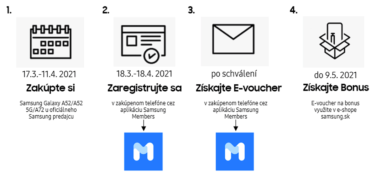 - E-voucher získate vygenerovaním kupónu (kódu) v aplikácii Samsung Members na prístroji, ktorý ste registrovali do kampane. E-voucher je nutné vygenerovať do 4 dní od dostania schvaľovacieho e-mailu, inak nárok na bonus zaniká. E-voucher nie je možné získať prostredníctvom iných prístrojov ako prístroja, ktorý bol registrovaný v kampani.