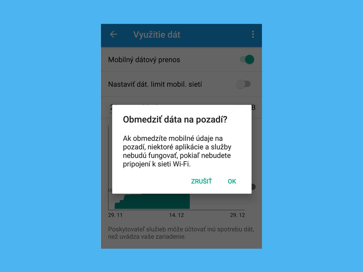 Na oplátku ale získate úplnú kontrolu nad tým, čo robia vaše aplikácie s dátami. Stačí si vo vašom ZTE otvoriť Nastavenia, tu využitie dát a cez menu vybrať Obmedziť dáta na pozadí.