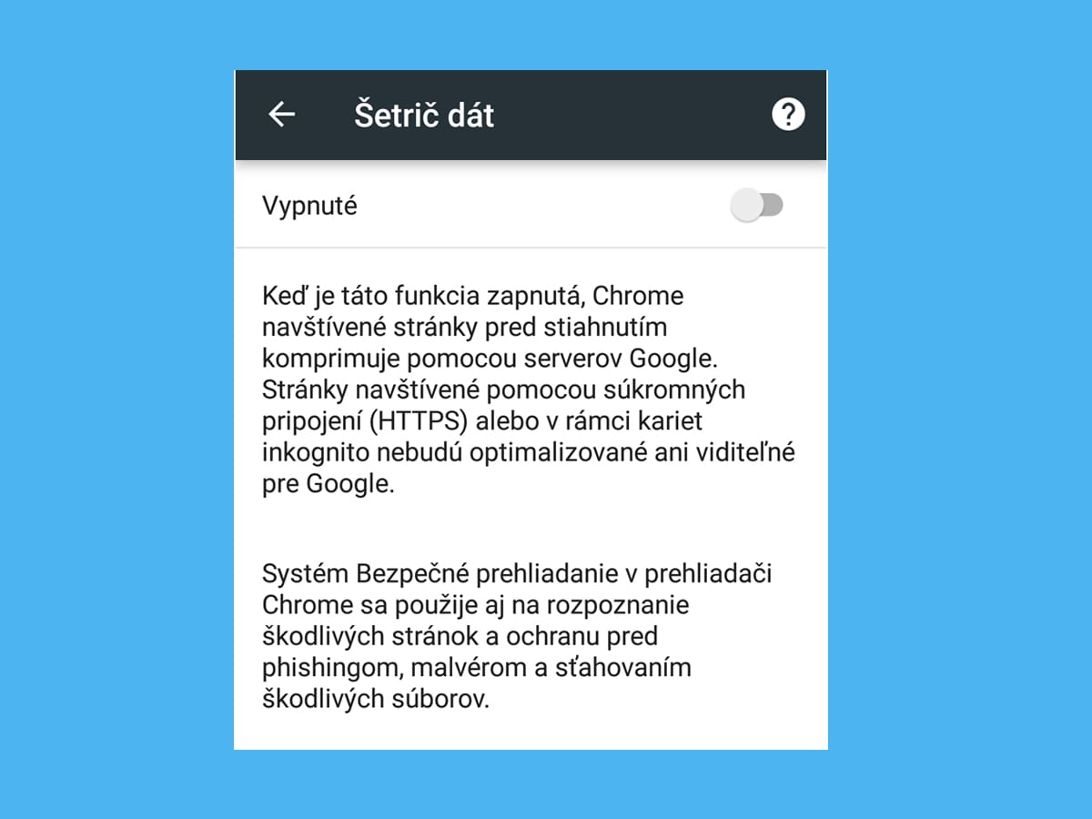 Google Chrome je najpoužívanejší prehliadač a zrejme ho budete chcieť používať aj vo vašom smartfóne ZTE A310. Aj on pamätá na dátovú spotrebu. Stačí si ho otvoriť, vybrať Menu – Nastavenia a nájdete tu funkciu Šetrič dát. Tá pracuje na princípe kompresie stránok. Spotreba dát z vášho prehliadača sa takto zníži približne o 20 až 30 %.