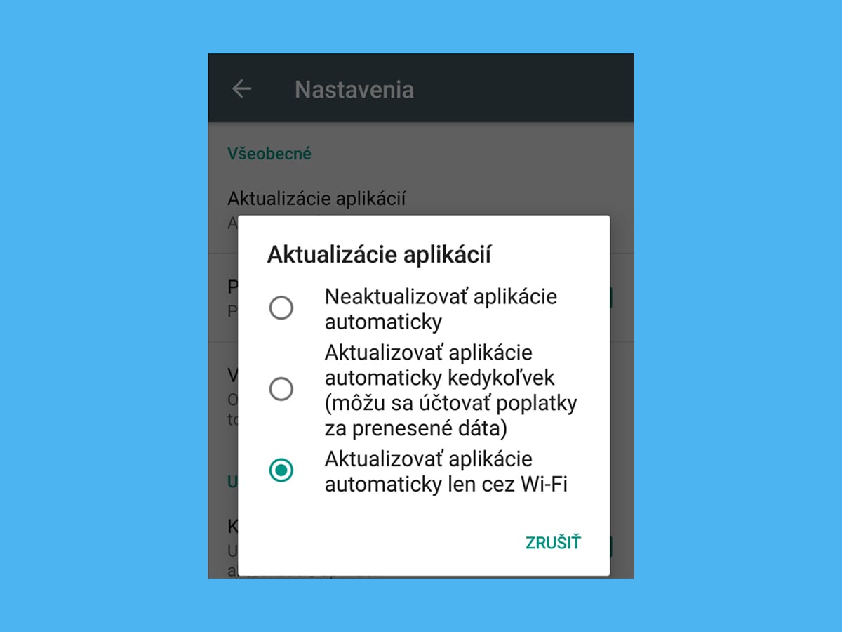 Úplne prvý krok, ktorý by ste mali spraviť, je vypnúť automatické aktualizácie mimo Wi-Fi. Vaše aplikácie sa aktualizujú často a dokážu minúť obrovské množstvo dát. Nastavenie je úplne jednoduché. Otvorte Obchod Play, zvoľte Nastavenia a vyberte možnosť Aktualizovať aplikácie automaticky len cez Wi-Fi.