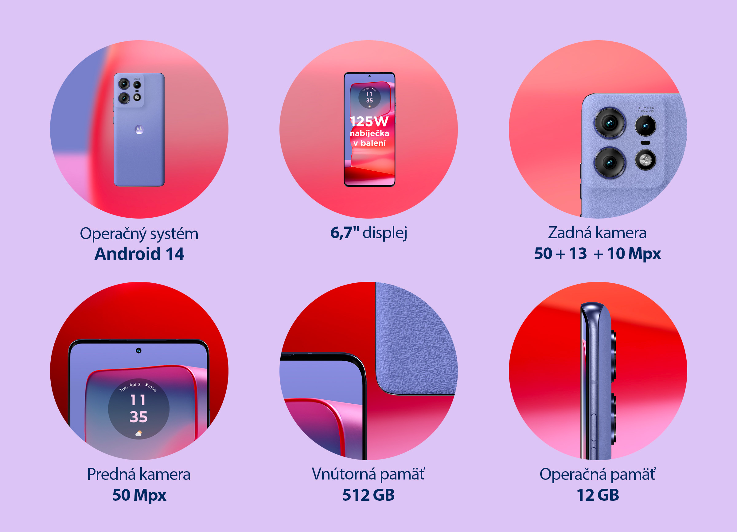 Výkon celému telefónu zabezpečuje Snapdragon 7 tretej generácie. Ide síce o starší typ procesora, no keďže má k dispozícii až 12 GB RAM, vie sa v pohode vyrovnať aj tým modernejším. Na uloženie pekných fotiek aj ďalšieho obsahu budete mať určite dostatok miesta, pretože Motorola Edge 50 Pro má až 512 GB vnútorné úložisko.