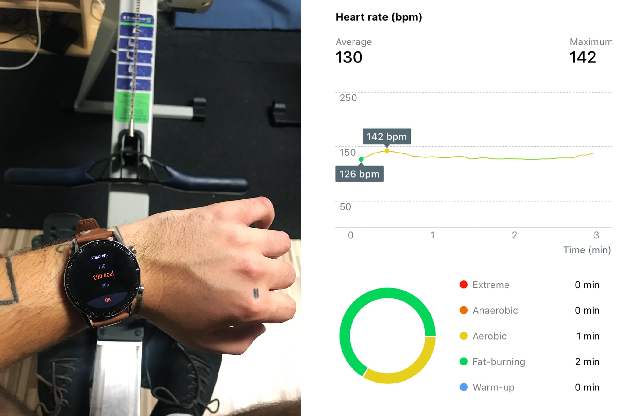 Na záver cvičenia som vždy vyskúšal aj tréningovú funkciu Veslovanie, ktorá funguje podobne ako ostatné. Môžete ju nechať voľne ísť alebo si nastaviť, aby vás upozornila, keď odveslujete istý čas alebo spálite zvolený počet kalórií.
