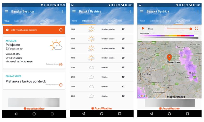 Na základnej obrazovke uvidíte aktuálne informácie o počasí na základe GPS polohy telefónu. Informácie ako vlhkosť vzduchu, a rýchlosť vetra či UV Index sú minimálne zaujímavé. V záložkách si môžete prezrieť hodinovú predpoveď, ktorá poteší detailom pre konkrétnu hodinu. K dispozícii je aj mapa oblačnosti. Aplikácia je bezplatná, teda počítajte s reklamami, ktoré sú však umiestnené v spodnej časti obrazovky a našťastie nepôsobia veľmi rušivo.