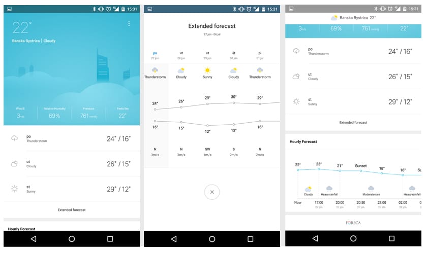Jednoduchá a oku lahodiaca aplikácia s material designom, ktorá zobrazí všetky podstatné informácie o počasí na jednom mieste. Pohyb v aplikácii je intuitívny a užívateľa nezahrnie množstvom nepotrebných informácií či reklám. Nehľadajte v nej mapy oblačnosti, či úhrn zrážok. Namiesto toho vám prehľadne ukáže predpoveď s krivkou teplôt na časovej osi na 10 dní dopredu. Zamrzí len absencia slovenčiny.