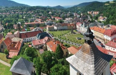 - 5. Presuňme sa od prírodných výjavov k ľudským vynálezom. Viete, ktoré banské mesto ležiace len 10 kilometrov od geografického stredu Európy, má v erbe polovicu zlatého kolesa?