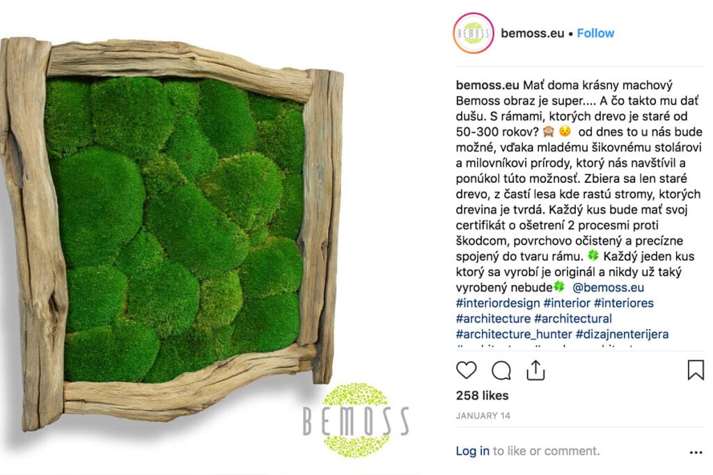Bemoss je slovenský výrobca živých zelených machových stien a obrazov. Takéto umelecké diela majú okrem estetickej funkcie aj množstvo ďalších výhod – tlmia hluk, regulujú vlhkosť vzduchu, čiastočne odpudzujú prach, pôsobia upokojujúco a sú ekologické.