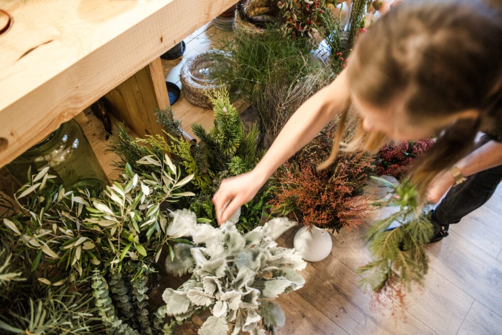 4. Postupne pridávajte prírodný materiál. Vyberajte druhy, ktoré pekne zoschnú. V tomto prípade sú to skimia, eukalyptus, rozmarín, mimóza, starček, bobuľoviny a tilandsia.