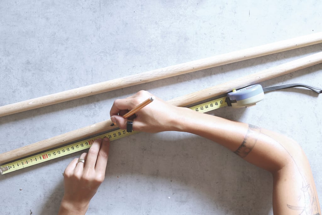 1.) Do oboch tyčí namerajte rovnako vzdialené body. Rozpätie medzi bodmi závisí len od vás.