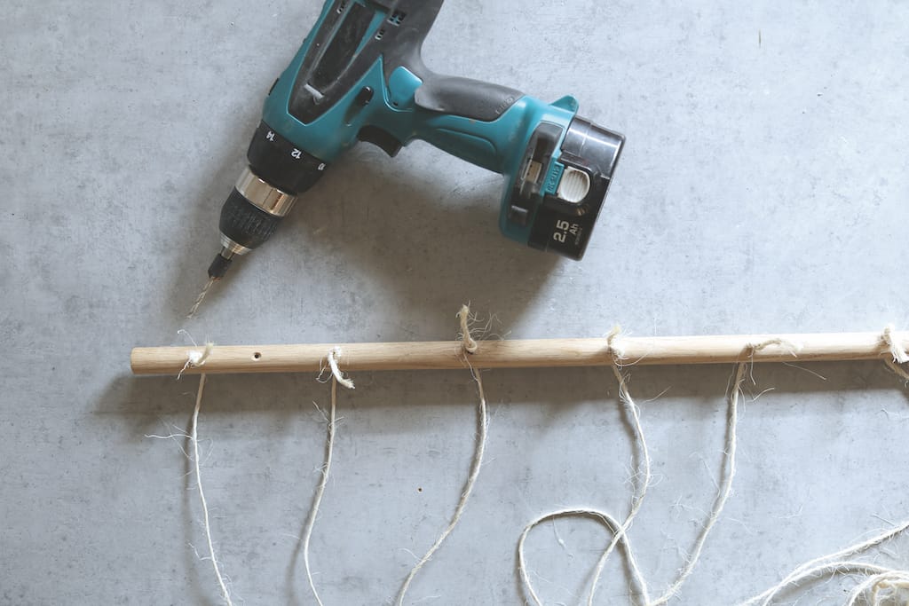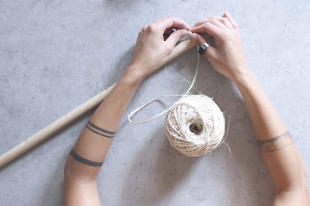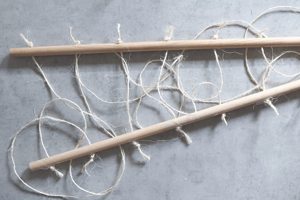 3.) Navlečte špagát do prvej dierky na jednej aj na druhej tyči. Na jednom konci spravte uzlík, následne namerajte takú dĺžku, akú dlhú chcete mať nástenku, nechajte určitý presah špagáta a odstrihnite ho.