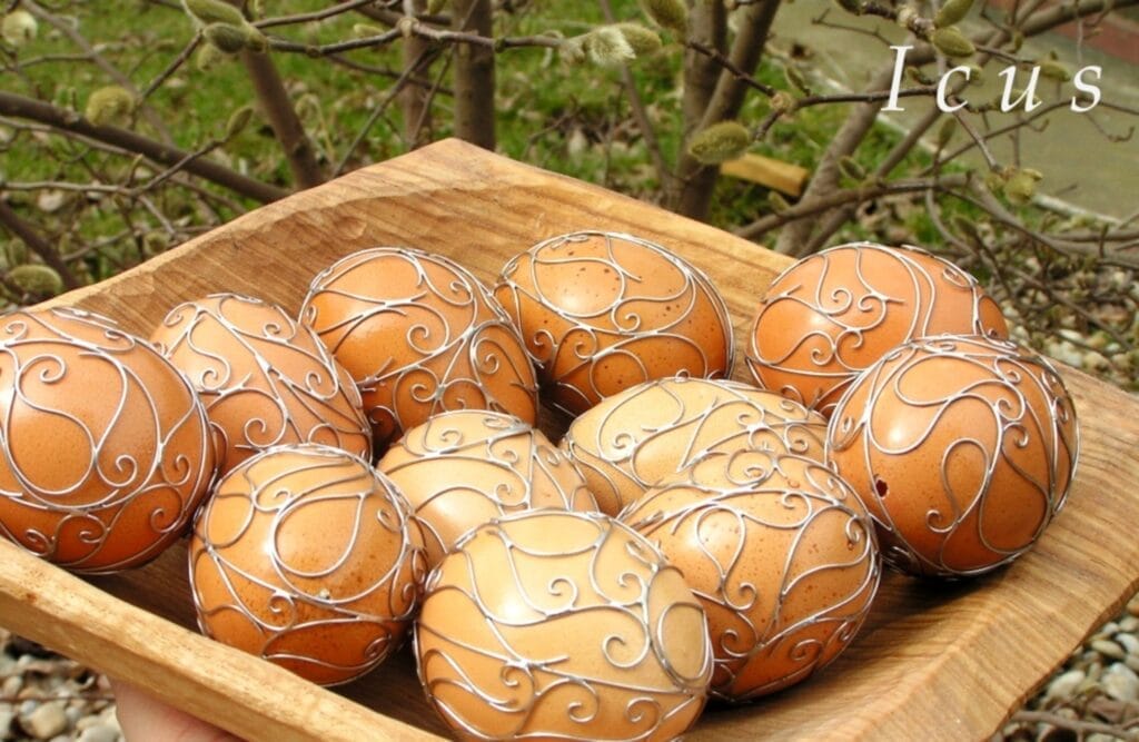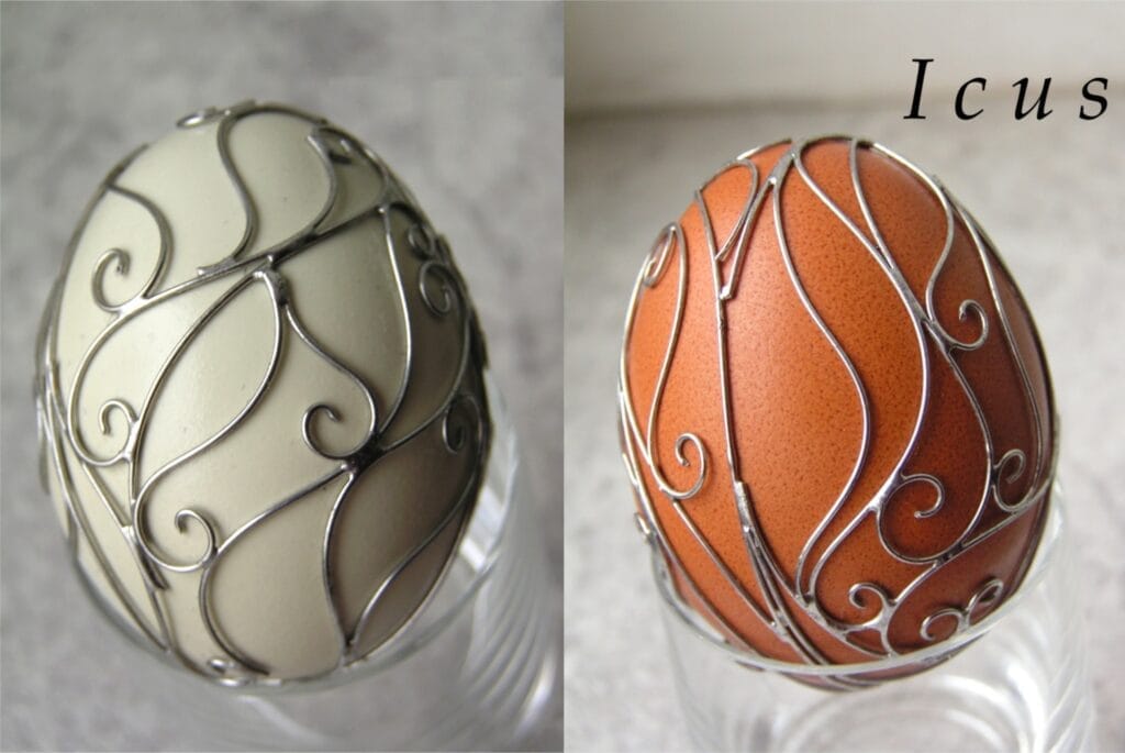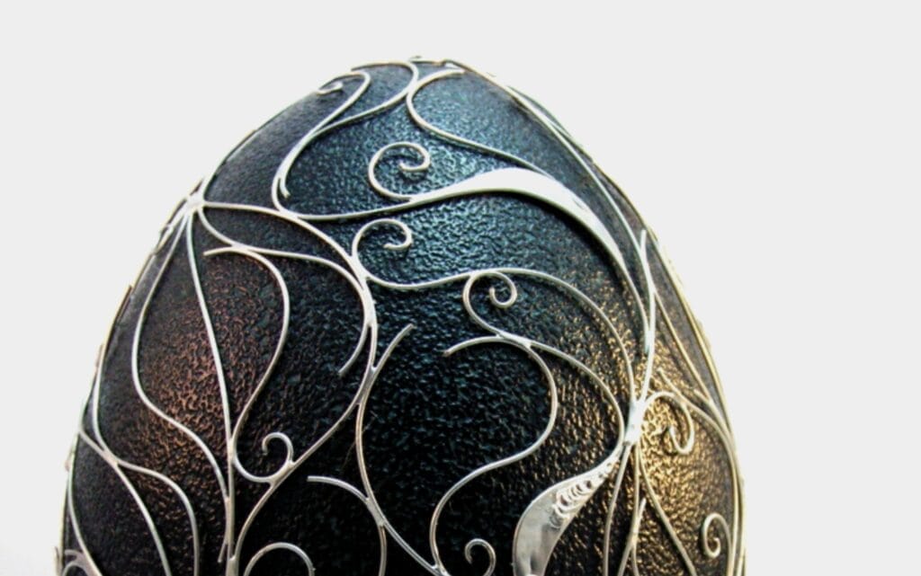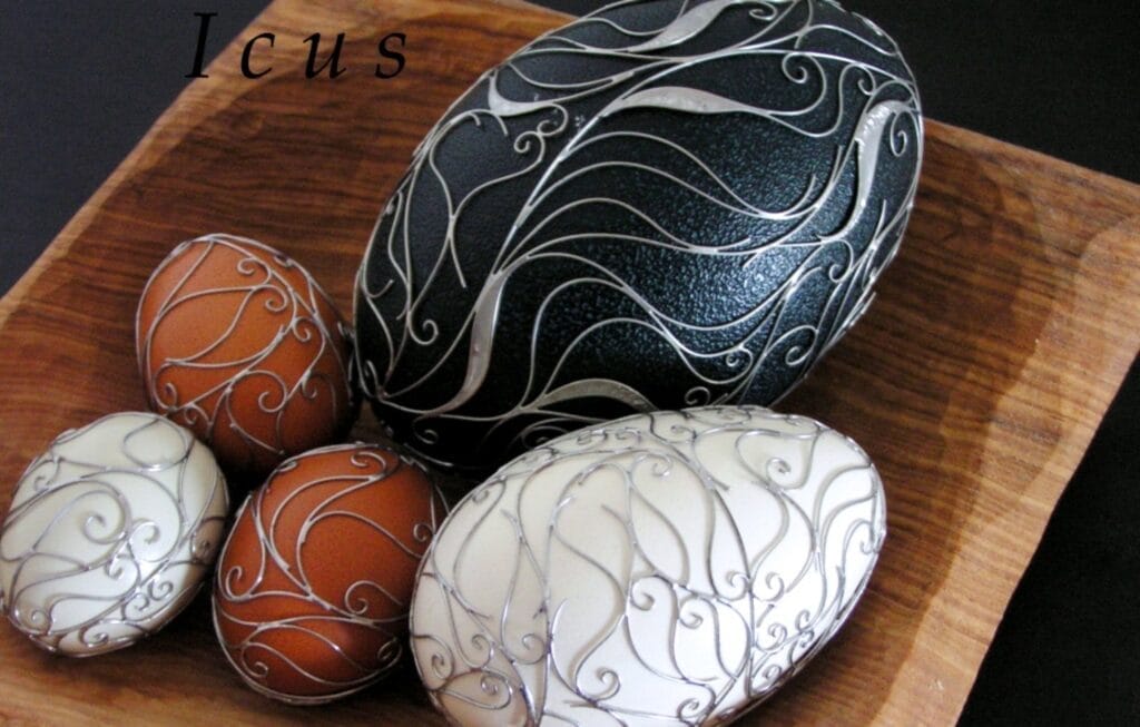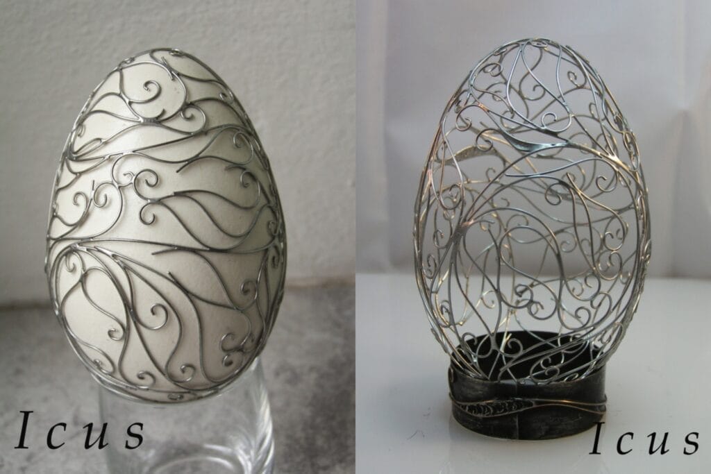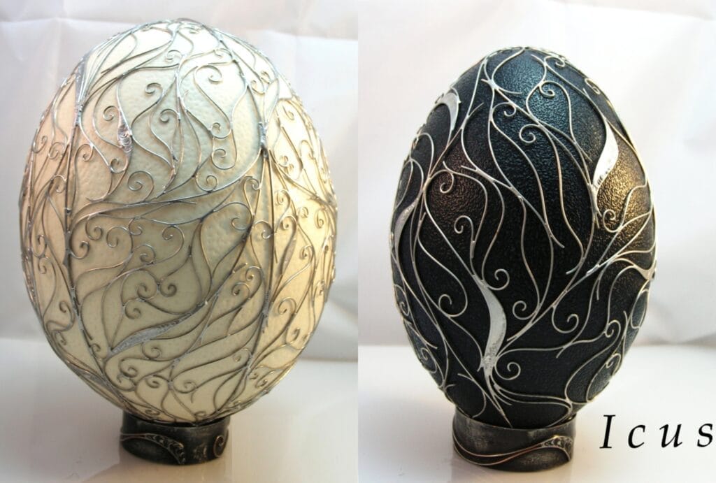 Používanie kombinácie drôtu a cínu sa nazýva Tiffany. V tomto prípade k slepačím a husacím vajíčkam, šikovný umelec pridal aj väčšie exempláre, pštrosie a emu. Lepšie na nich vynikne dekoratívnosť cínovania ako pri menších mierkach. Drôtený vzor je starostlivo ošetrený, aby ani časom nestrácal na kráse a lesku.