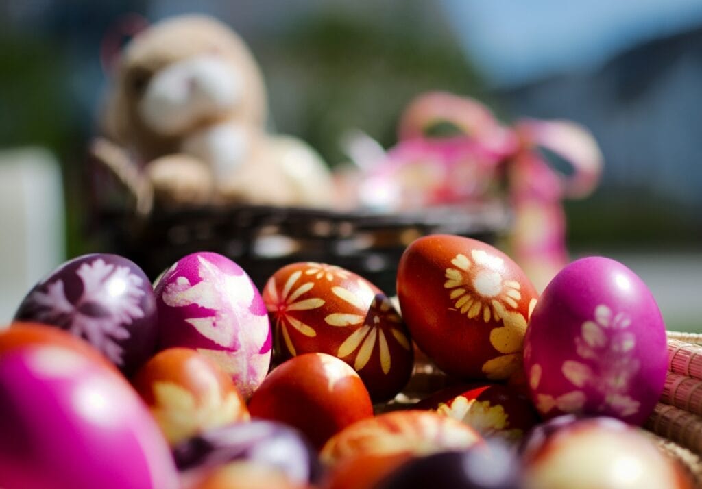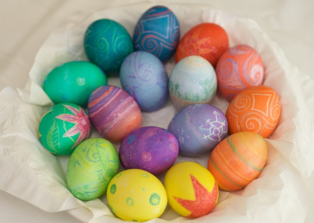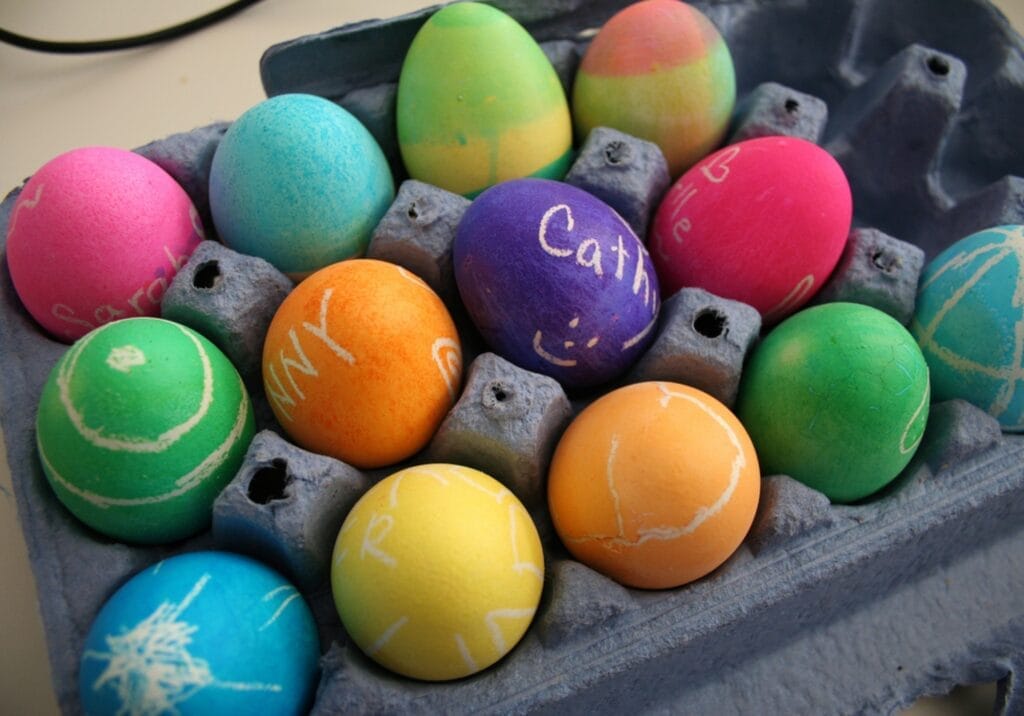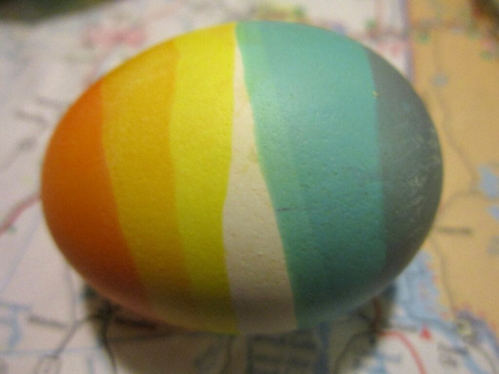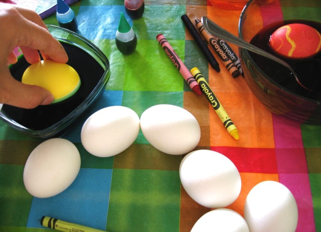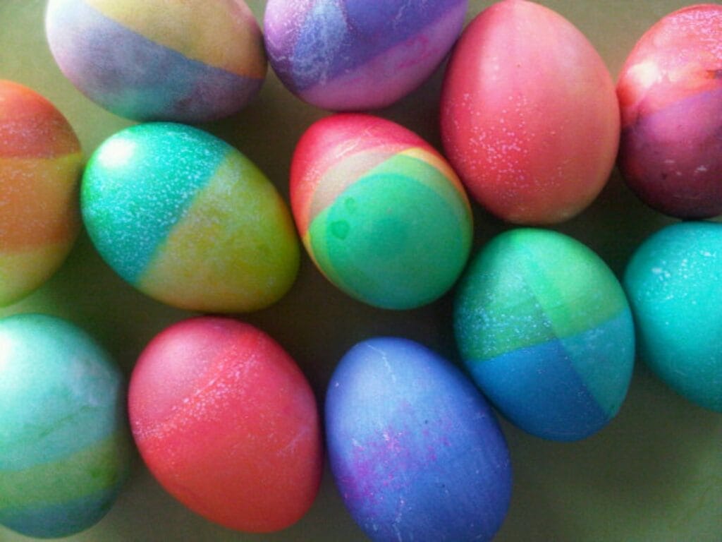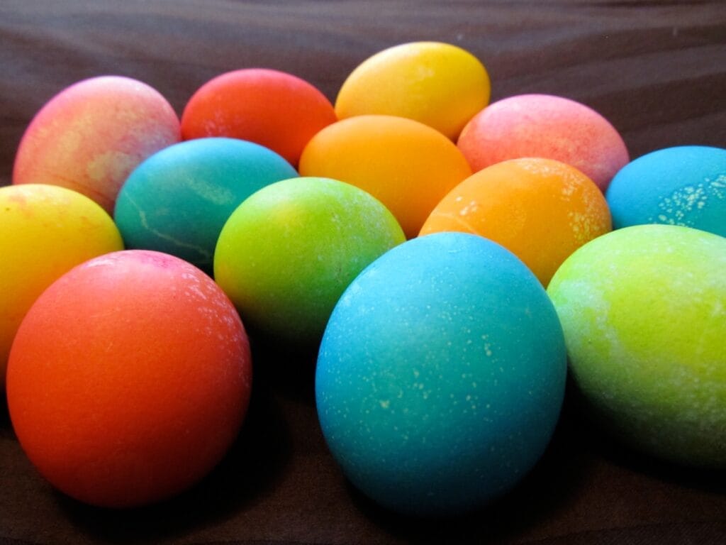 Farebné vajíčka zvládne doma každý a pritom si môžete sami nakombinovať obľúbené farebné variácie. Budete potrebovať len potravinové farby, poháre alebo misky a lyžičky na vyberanie. Vajcia môžete namáčať celé alebo len časti, a tým vytvárať vzory a odtiene. Ak pred namočením pomaľujete škrupinku voskovkou, obrázok zostane nezafarbený.