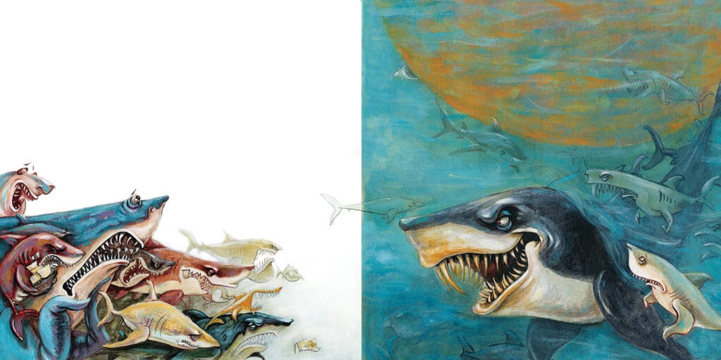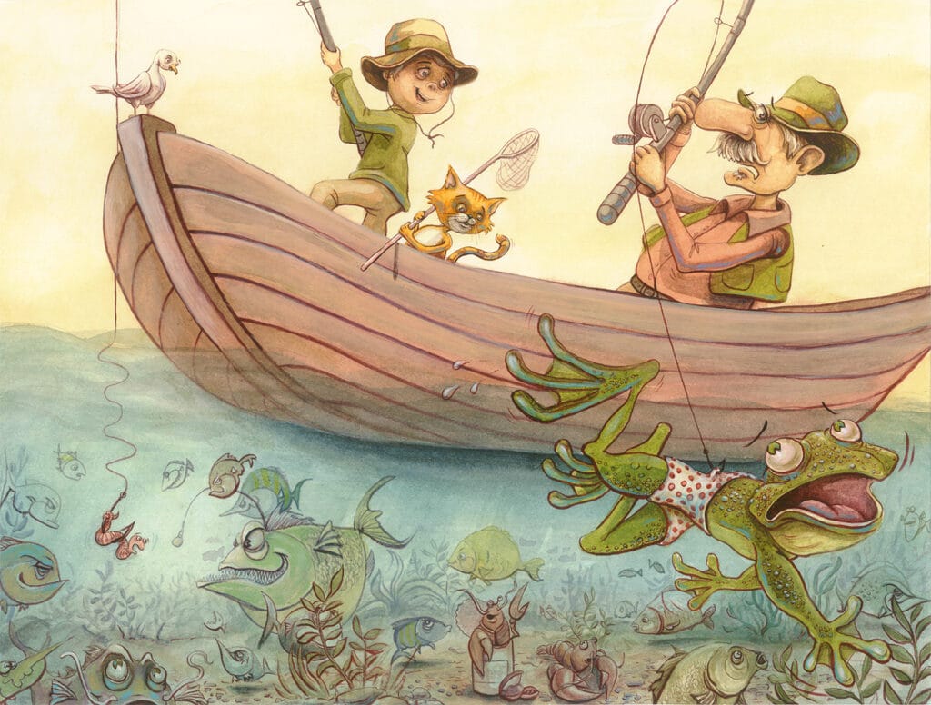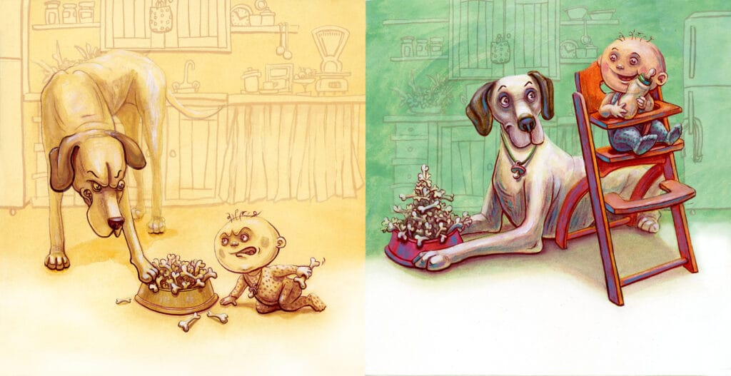 Prvotné nápady sú často najlepšie, ale svoju dynamiku si musí zachovať celý priebeh knižky. Potom sa zastavujem pri jednotlivých nápadoch. Niektoré veci sú jasné, s inými sa viac vytrápim. Bohužiaľ, nepatrím medzi tých usporiadaných ilustrátorov s prepracovaným storyboardom. Ten mi väčšinou vzniká až postupne, postupne sa dopĺňa.
