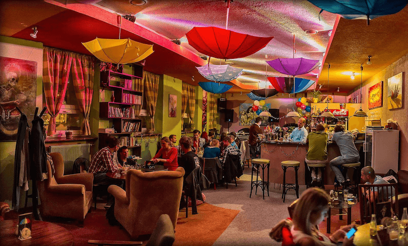 Na káve sa budete cítiť ako u v obývačke. Veľké retro sedačky a originálny nábytok, skvelá kávička a čerstvé koláče vytvárajú pohodovú atmosféru. Zaujímavou dekoráciou sú bezpochyby aj farebné dáždniky visiace zo stropu. Pravidelne sa tu organizujú premietania zaujímavých filmov, cestopisov a hrajú tu rôzne kapely.