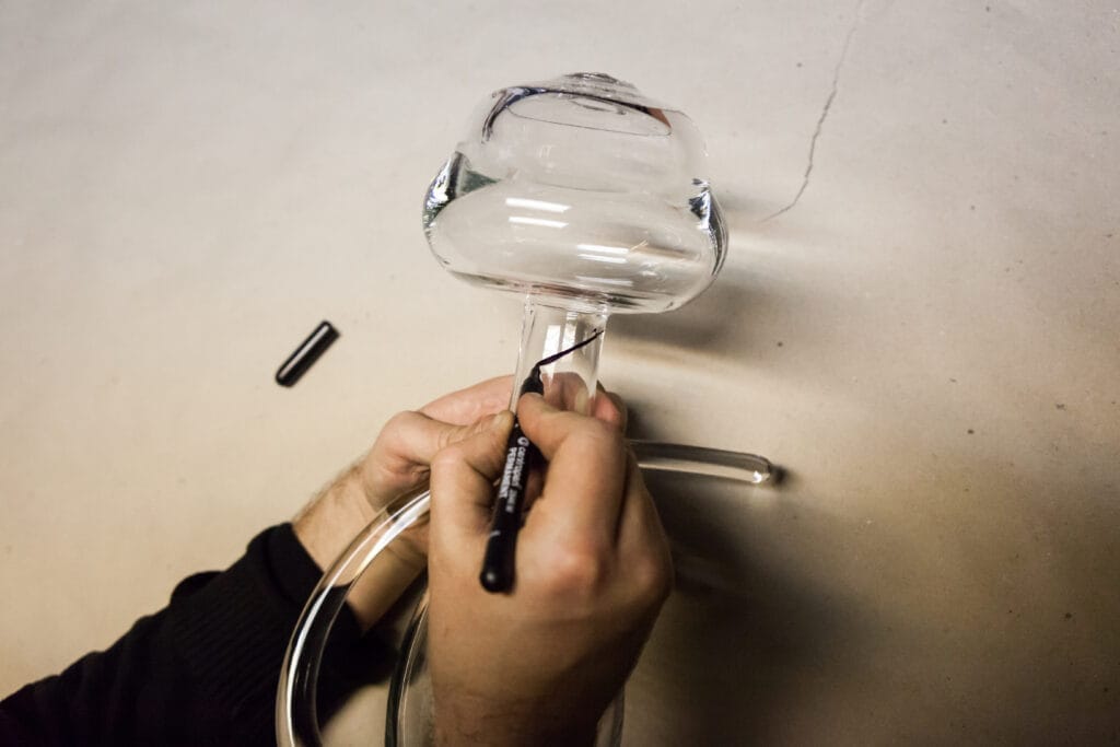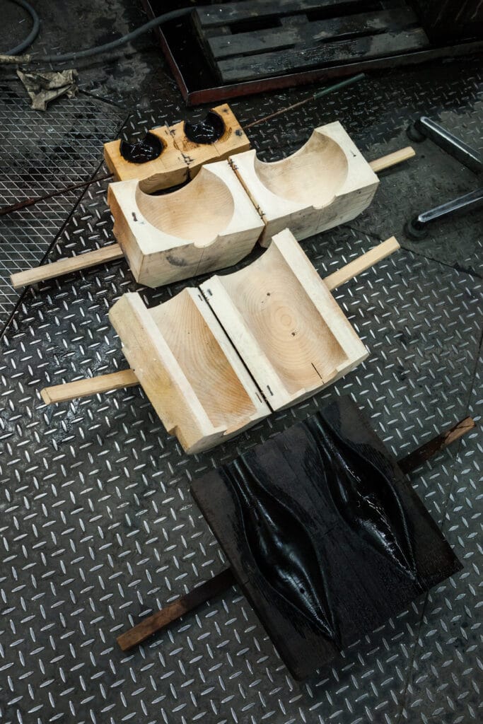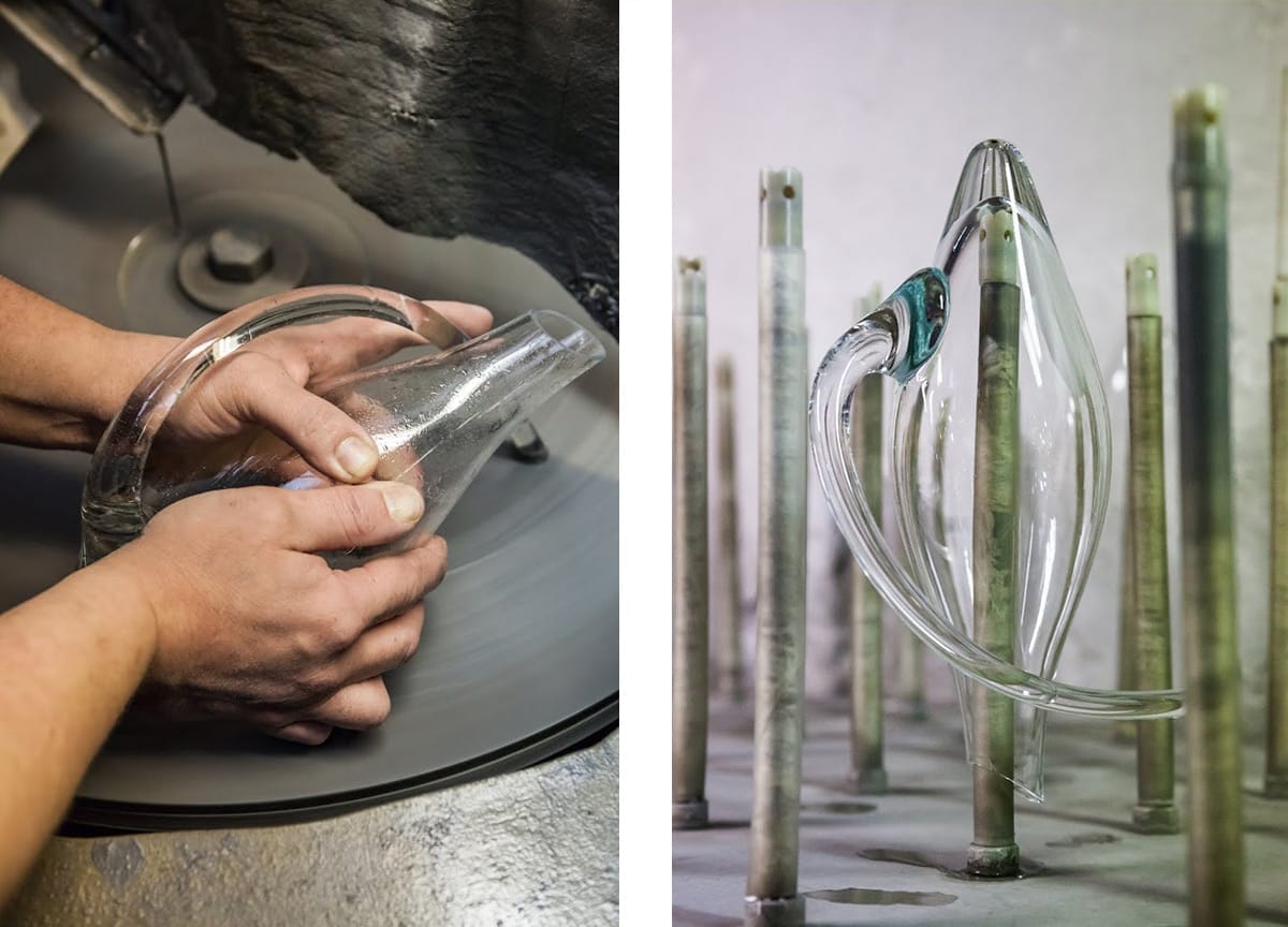Po vybratí z formy ešte treba dorobiť rukoväť, ktorá zároveň slúži ako stojan. Sklár ju lepí a tvaruje ručne, preto nikdy nie sú dva kusy úplne rovnaké.