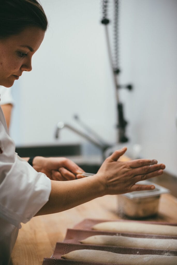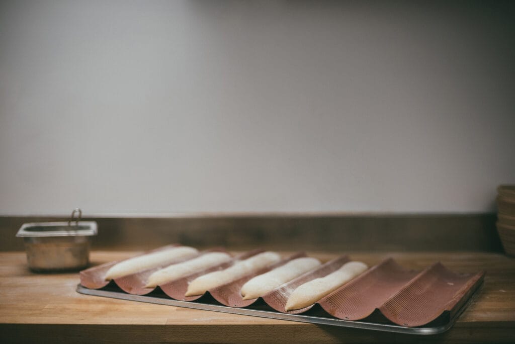 4. Následne sa cesto rozdelí na menšie časti, z ktorých sa vyformujú bagety. Buď sa poukladajú do špeciálnych bagetových foriem, alebo sa cesto zabalí do nebieleného ražného plátna. To sa pozahýba tak, aby sa jednotlivé bagety medzi sebou nedotýkali.
