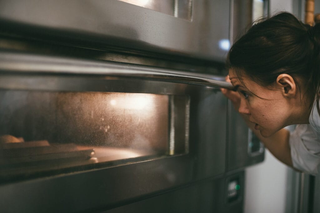 8. Hneď, ako do nej pekár nasadí bagety a zavrie ju, pec na ne vystrekne veľký oblak pary. Tá je oveľa lepší vodič tepla ako chlebové cesto, vďaka čomu sa kôrka ohreje a uzavrie oveľa rýchlejšie. V tom momente sa stane viacero vecí naraz – vlhkosť vo vnútri začne kondenzovať priamo do stredu bagiet. A aj keď sa para rýchlo vyparí, pridaná vlhkosť pomôže elasticite kôrky, aby narástla prirodzene a bez veľkých trhlín.
