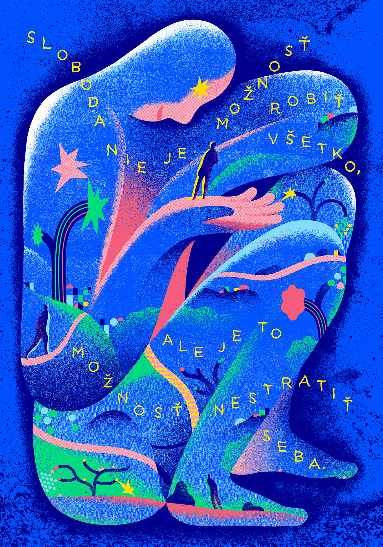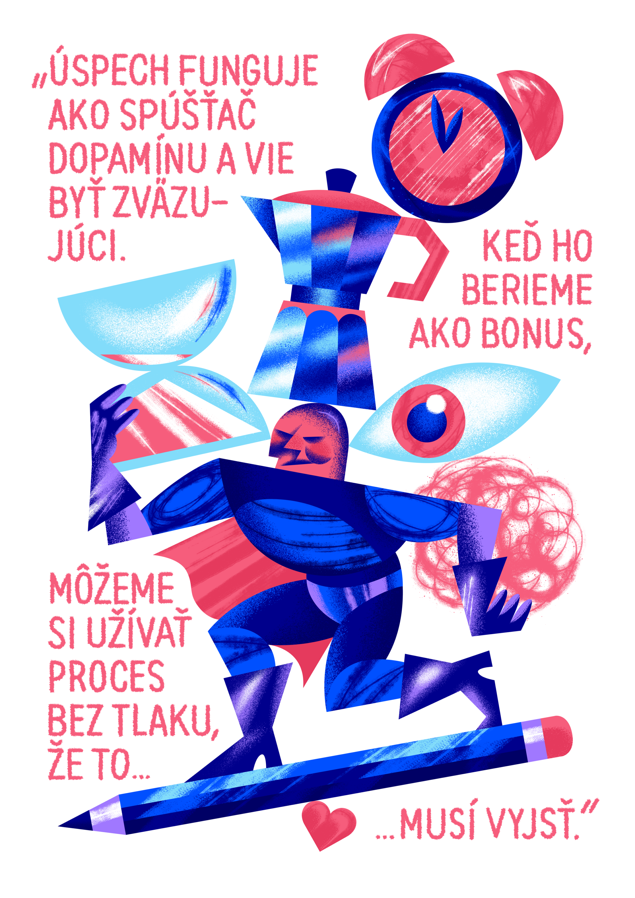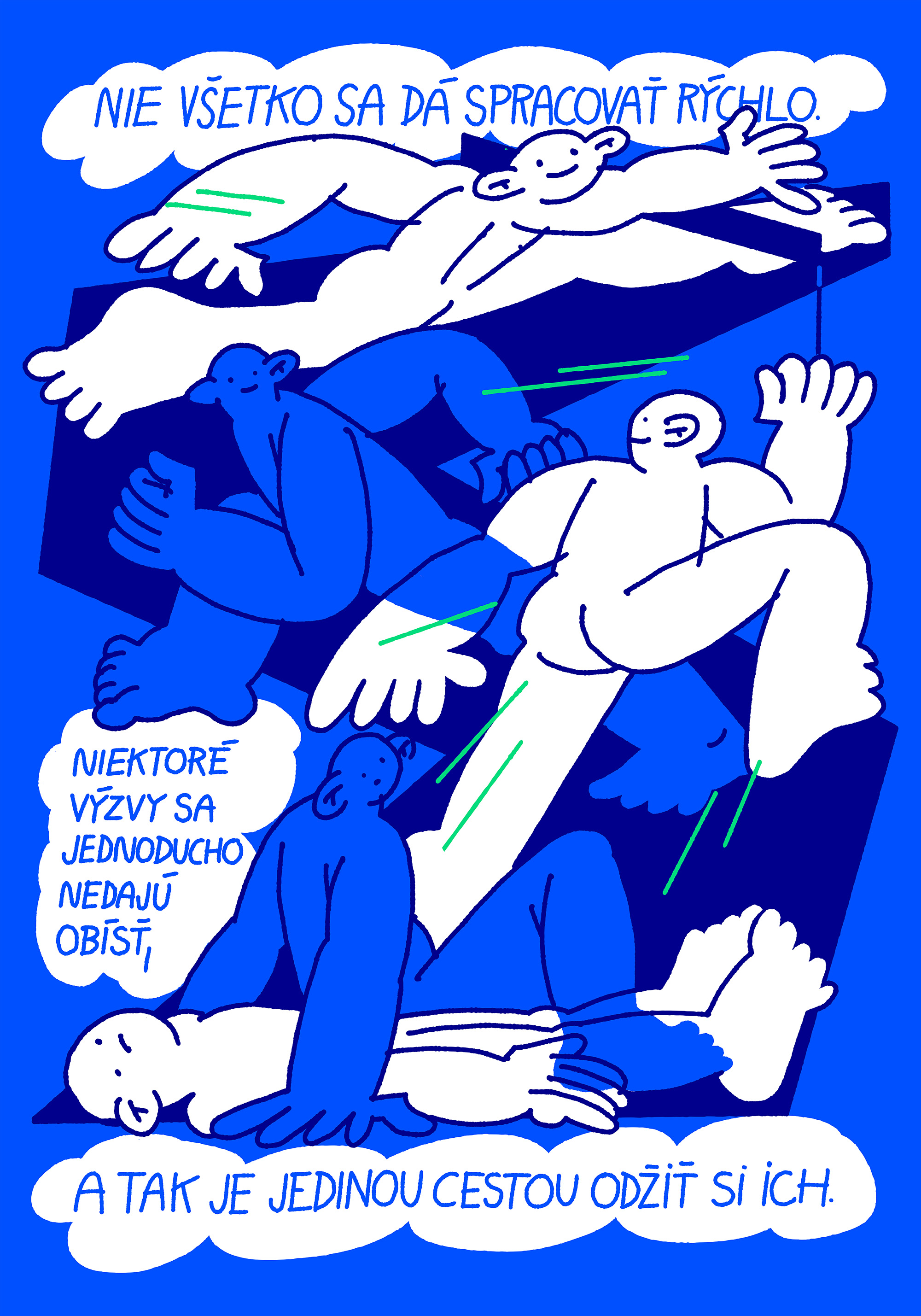 Ja som to v kresbe znázornil ako postupné zdvíhanie sa zo zeme. Môže to pôsobiť, že pri riešení problémov stačí málo na to, aby sme mohli byť šťastní, a je to len o našom pozitívnom nastavení. Nedá sa ráno zobudiť s tým, že budem pozitívny a je to vybavené. Tak som to nemyslel, ale je to cesta, je to proces a táto téma je hlbšia. Ja som sa to snažil zobraziť jemnejšie, opisnejšie a skratkovitejšie, aby vynikli proces a cesta, bolo to čitateľnejšie a sedelo to s citátom.