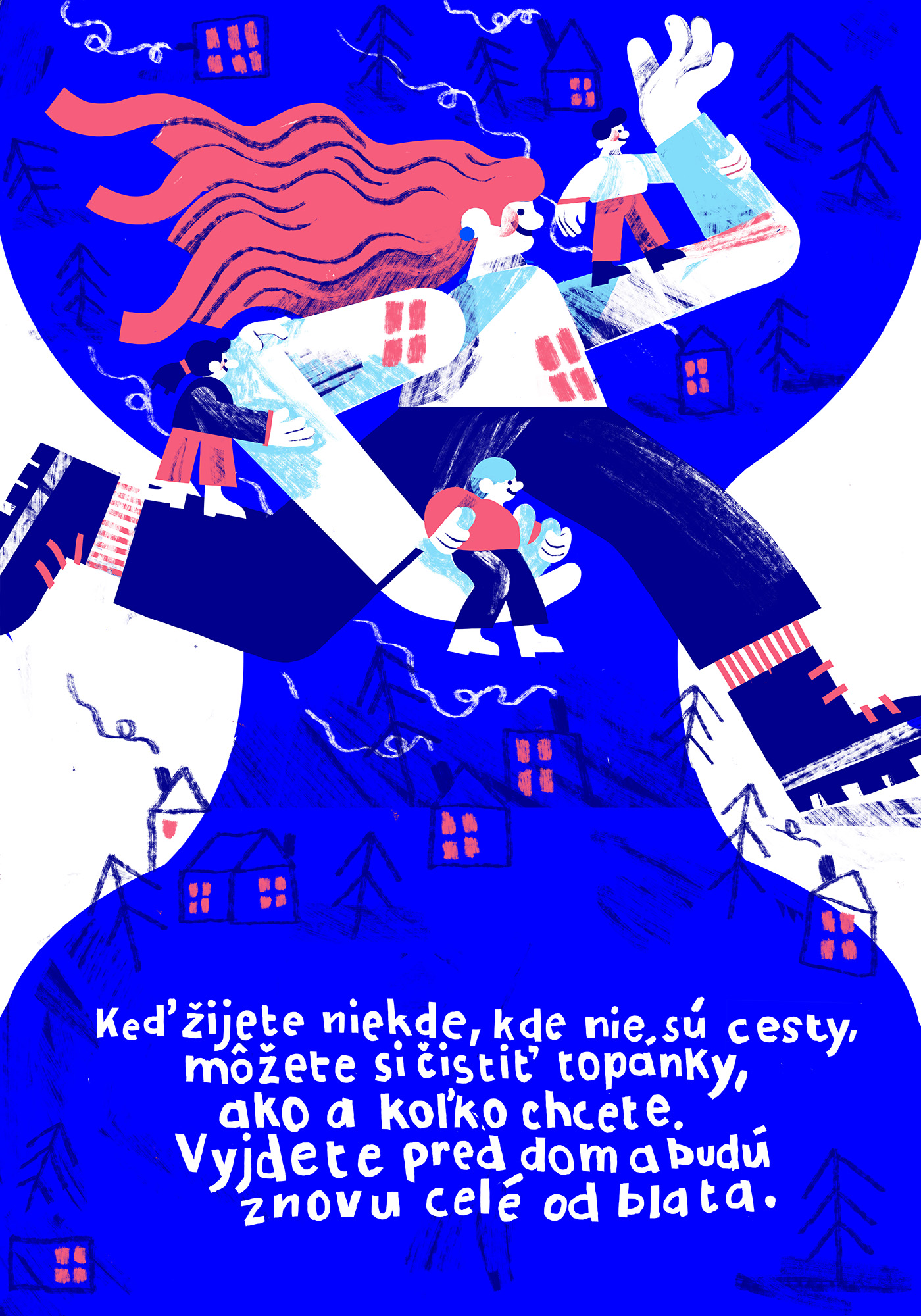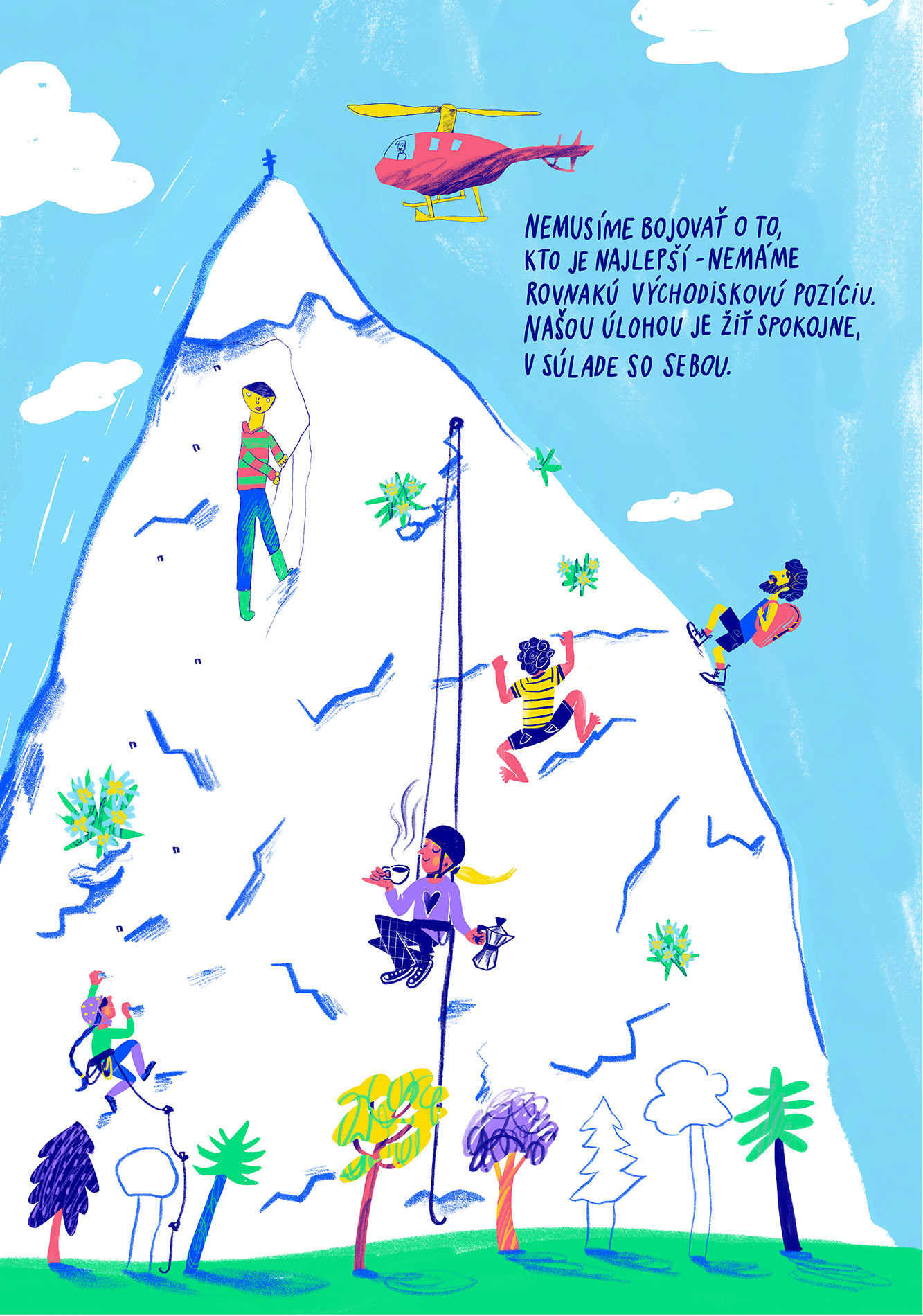 Marta Matus: „Rada používam v tvorbe humor. Ilustráciu som odľahčila tým, že som zobrazila ľudí pri športe. Vybrala som si horolezcov. Niekto je bosý a bez istenia, niekto si vychutnáva kávu uprostred cesty nahor, iný sa dostane do cieľa vrtuľníkom (samozrejme, bude prvý).