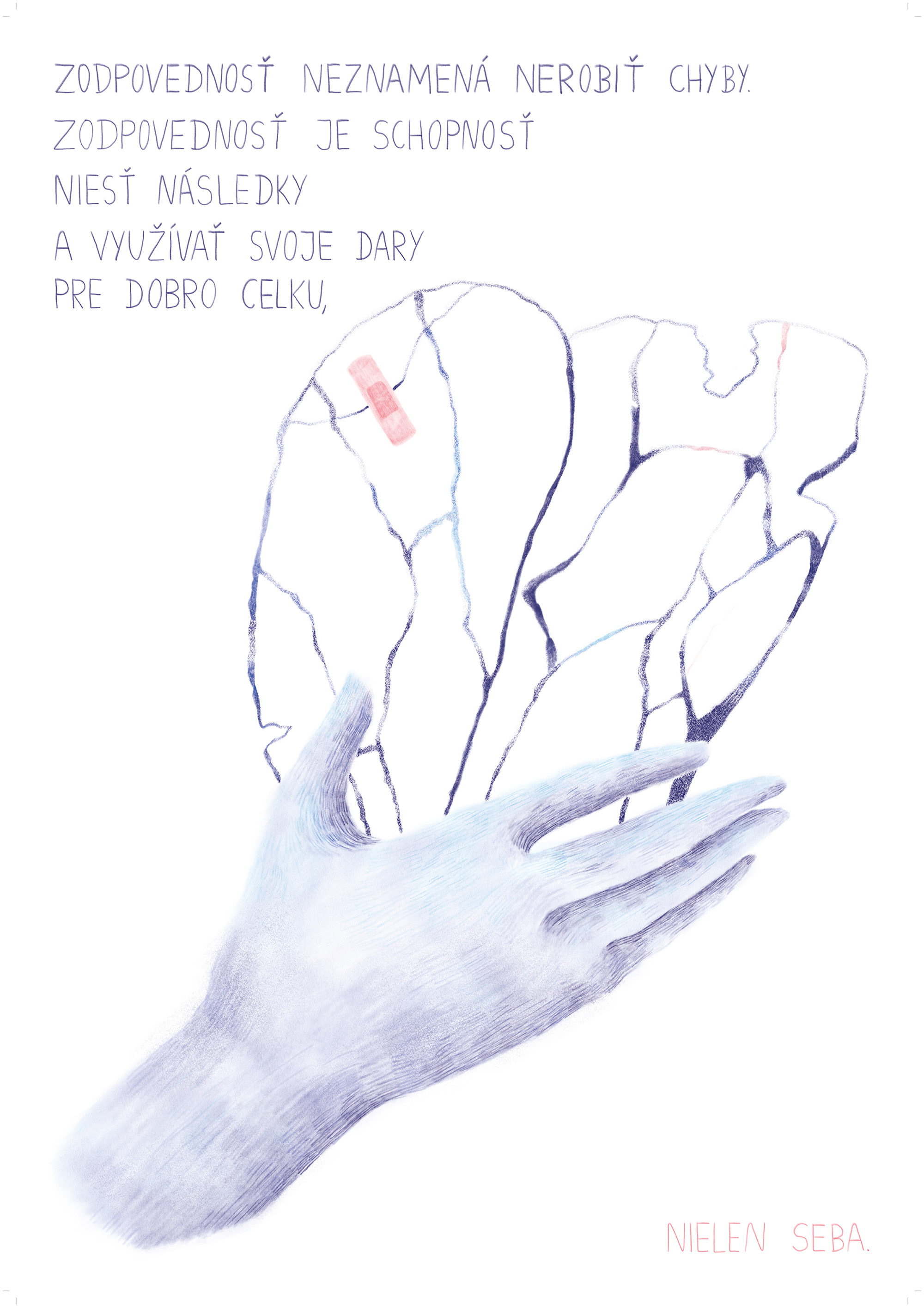 Ilustrovala to Daniela Vagašová: „Na prvé prečítanie vo mne citát vyvolal uvoľnenie a určitý druh pokoja. Vnímala som ho ako pripomenutie, že zodpovednosť nespočíva v dokonalosti alebo v absencii chýb, ale v schopnosti ich prijať a niesť ich dôsledky. Zároveň sa tam pre mňa objavila krehkosť, ktorú nevnímam ako slabosť, ale skôr ako prirodzenú súčasť bytia, s ktorou sa človek učí pracovať.