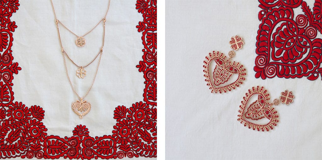 S folklórom si väčšina z nás spája najmä hudbu a tanec. Avšak, ako inšpirácia pre šperky má aj jeho vizuálna časť čo ponúknuť – kroje, výšivky, maľby, ale aj nábytok. „S obdivom študujem ornamenty na krojoch a hneď si vizualizujem, ako by sa dali pretransformovať do šperkov,” dodáva.