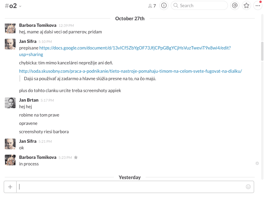 Virtuálna kancelária a zároveň komunikačný uzol. Umožňuje priamu komunikáciu medzi dvomi členmi tímu a vie vytvárať “miestnosti” na hromadné konverzácie o konkrétnych témach alebo projektoch.