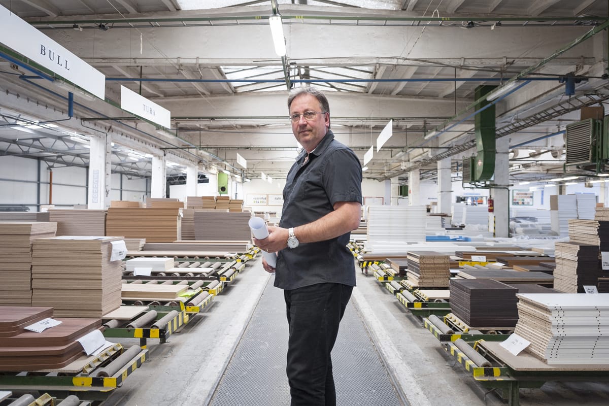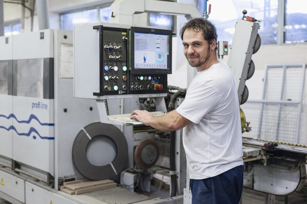 Rovnako ako nárezové centrum, aj vŕtacie centrum je automatizované. Pracovník dohliada, či všetko ide podľa vopred stanoveného plánu. Do materiálu sa vyvŕtajú otvory pre spojovací materiál.