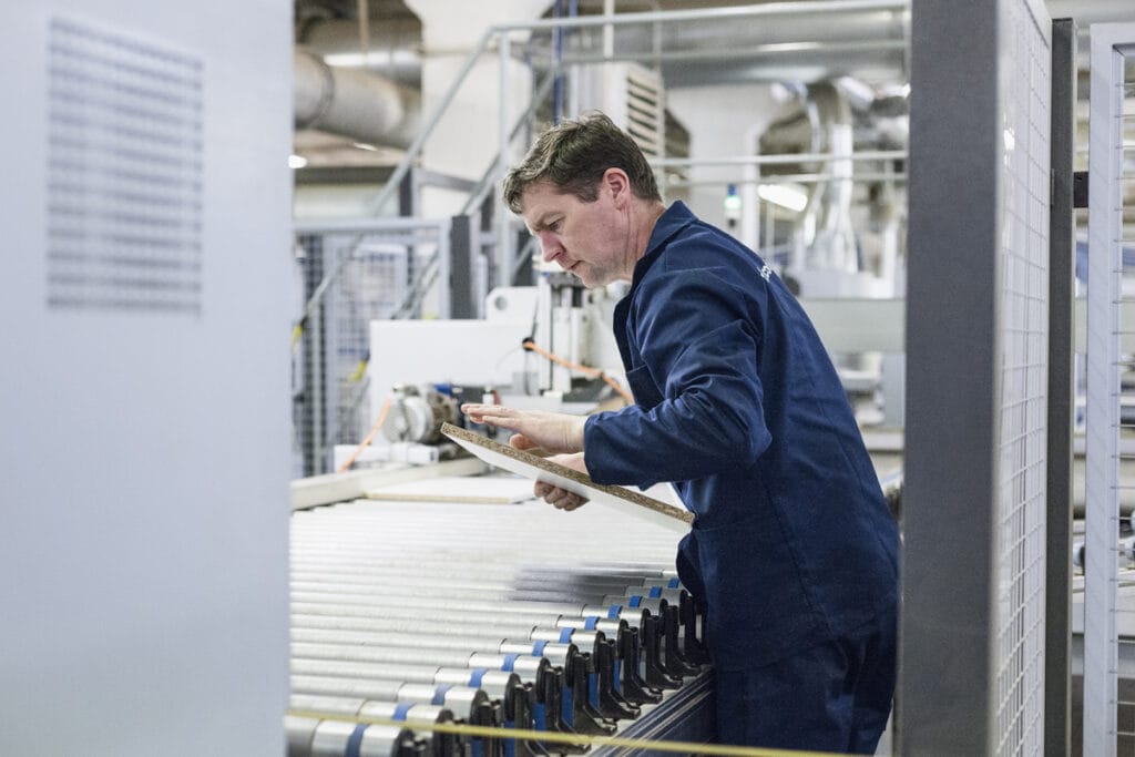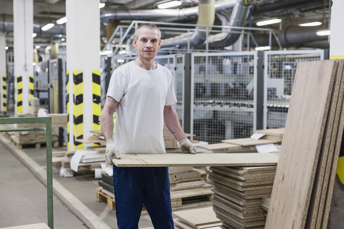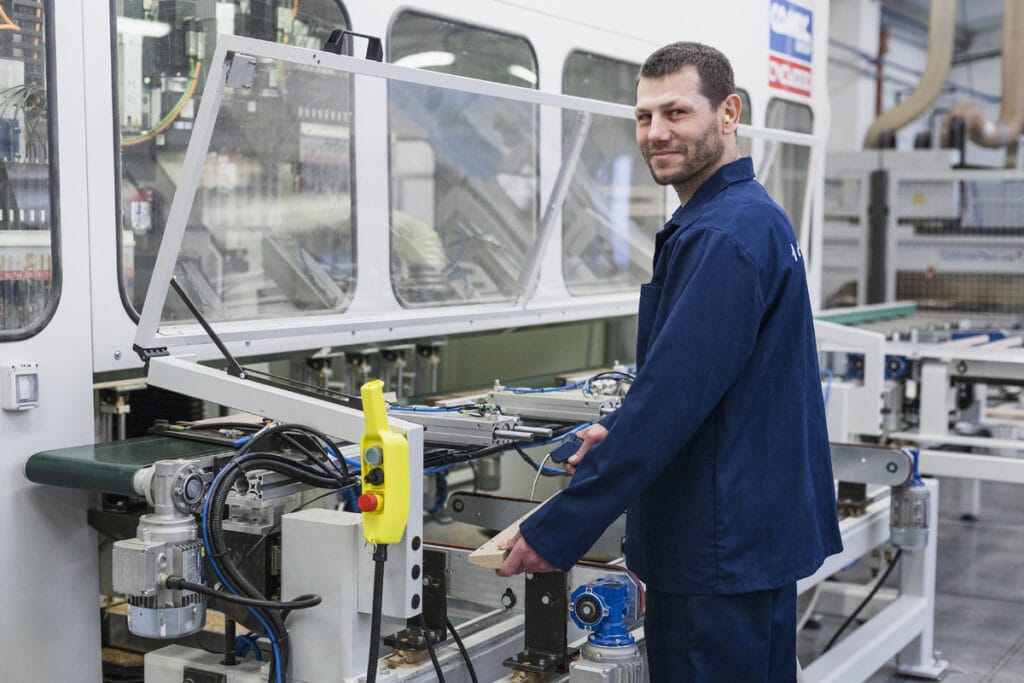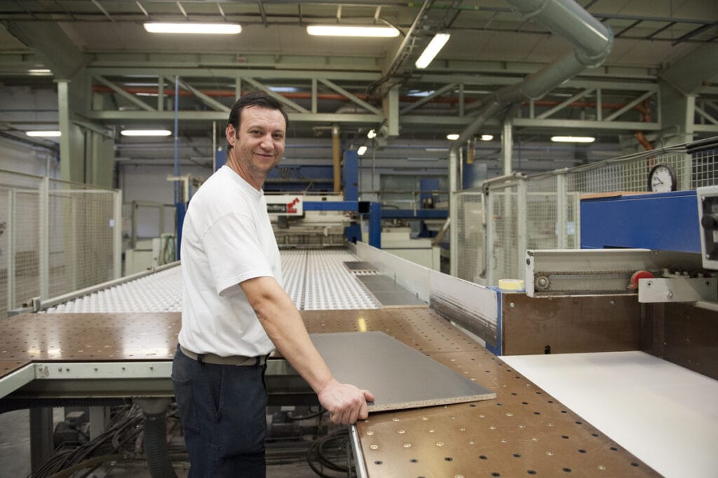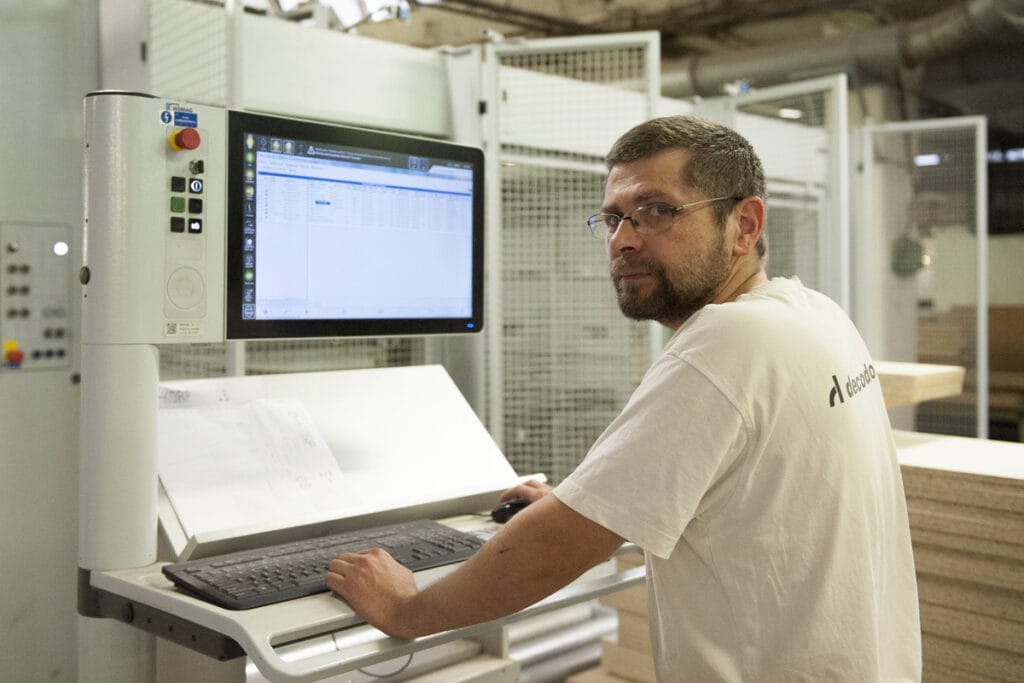 Začiatok automatizovanej linky, v ktorej je dielec olepený hranou a do dielca sú vyvŕtané konštrukčné otvory. Na konci tohto procesu spraví pracovník výstupnú kontrolu produktu.