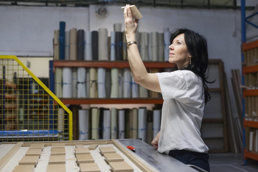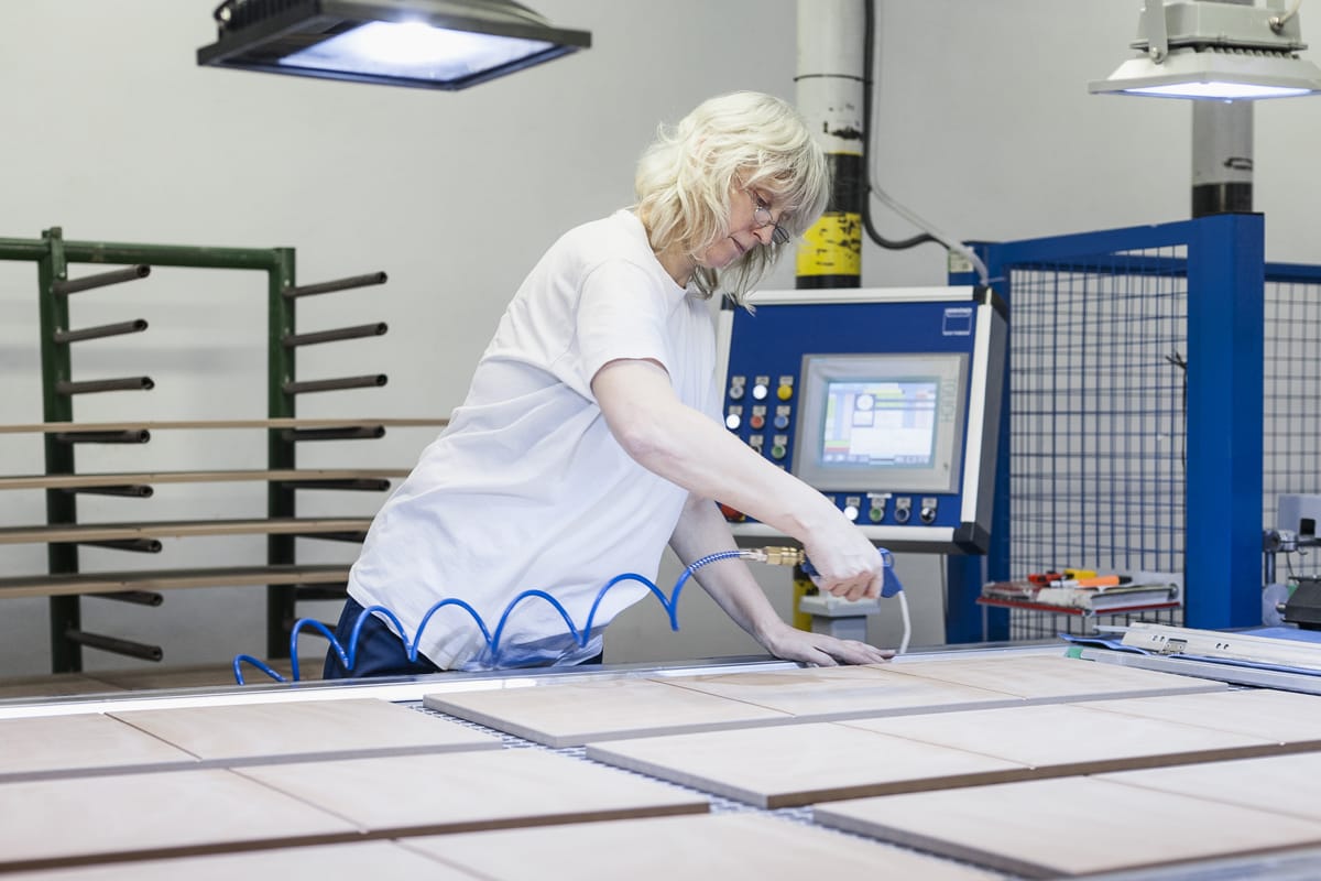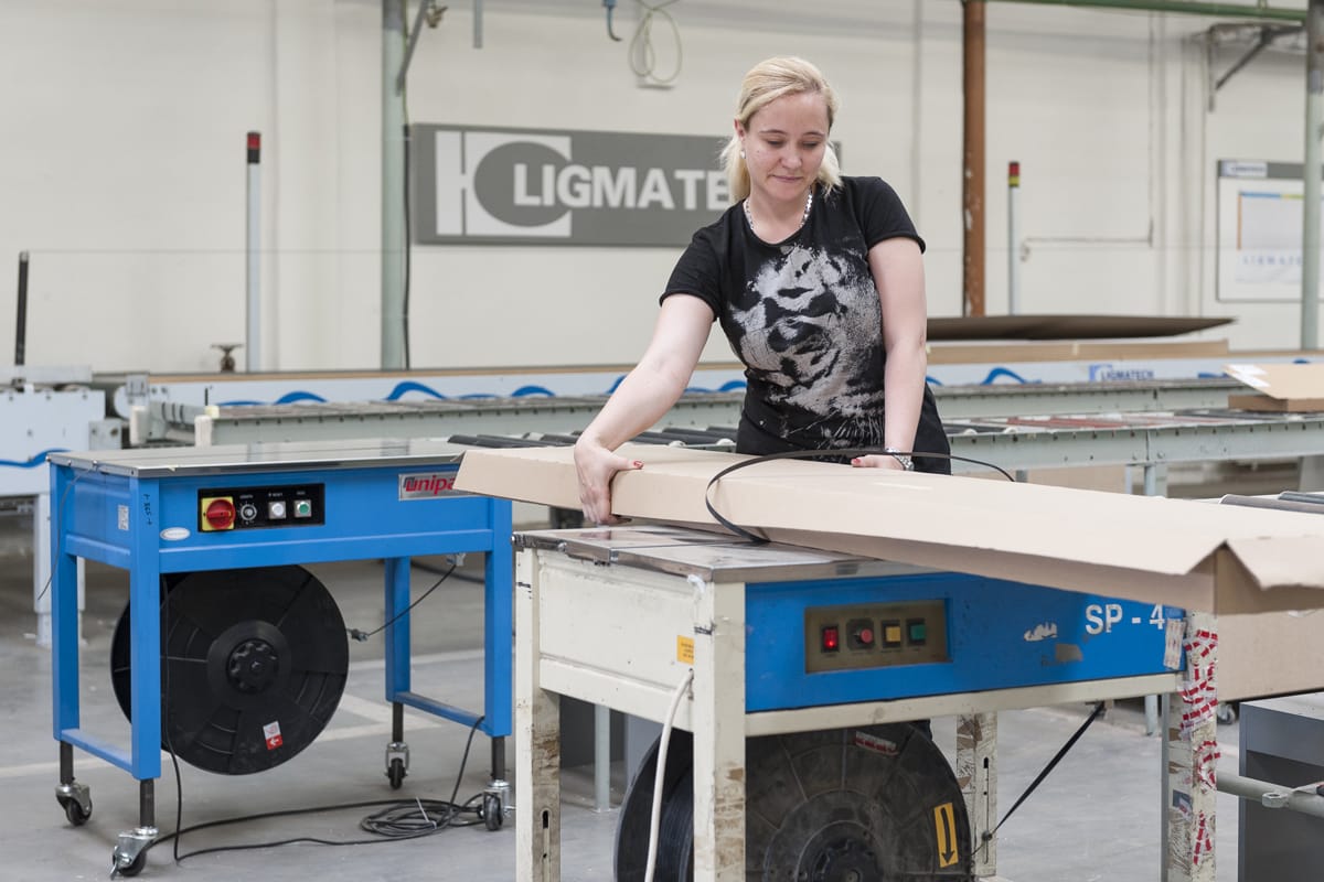 V lisovacom centre pripraví pracovníčka dvierka na zalisovanie fóliou.