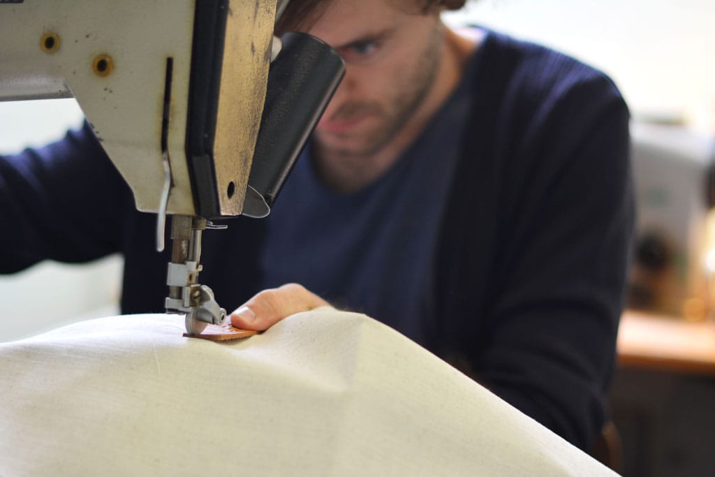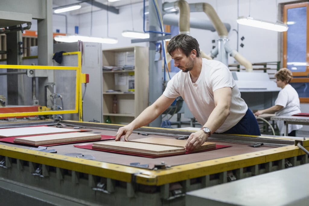 V hranovacom centre pracovník laserovo olepí hrany nábytkovou hranou.