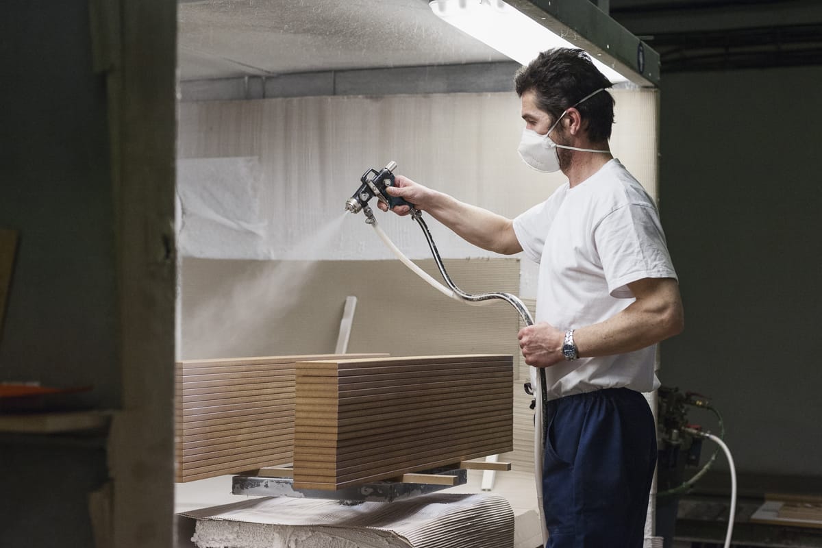 Výroba dvierok na nábytok – striekaním sa dosiahne rovný povrch. Na takto upravený povrch bude zalisovaná dekoračná fólia, ktorá tvorí dizajn celého výrobku.
